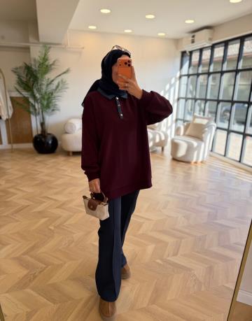 Bordo Kol Pile Detaylı Oversize Sweatshırt