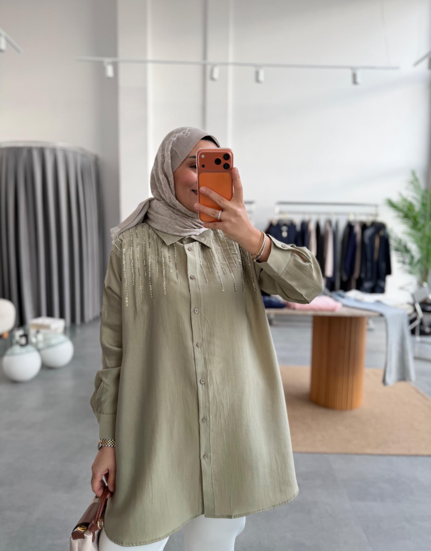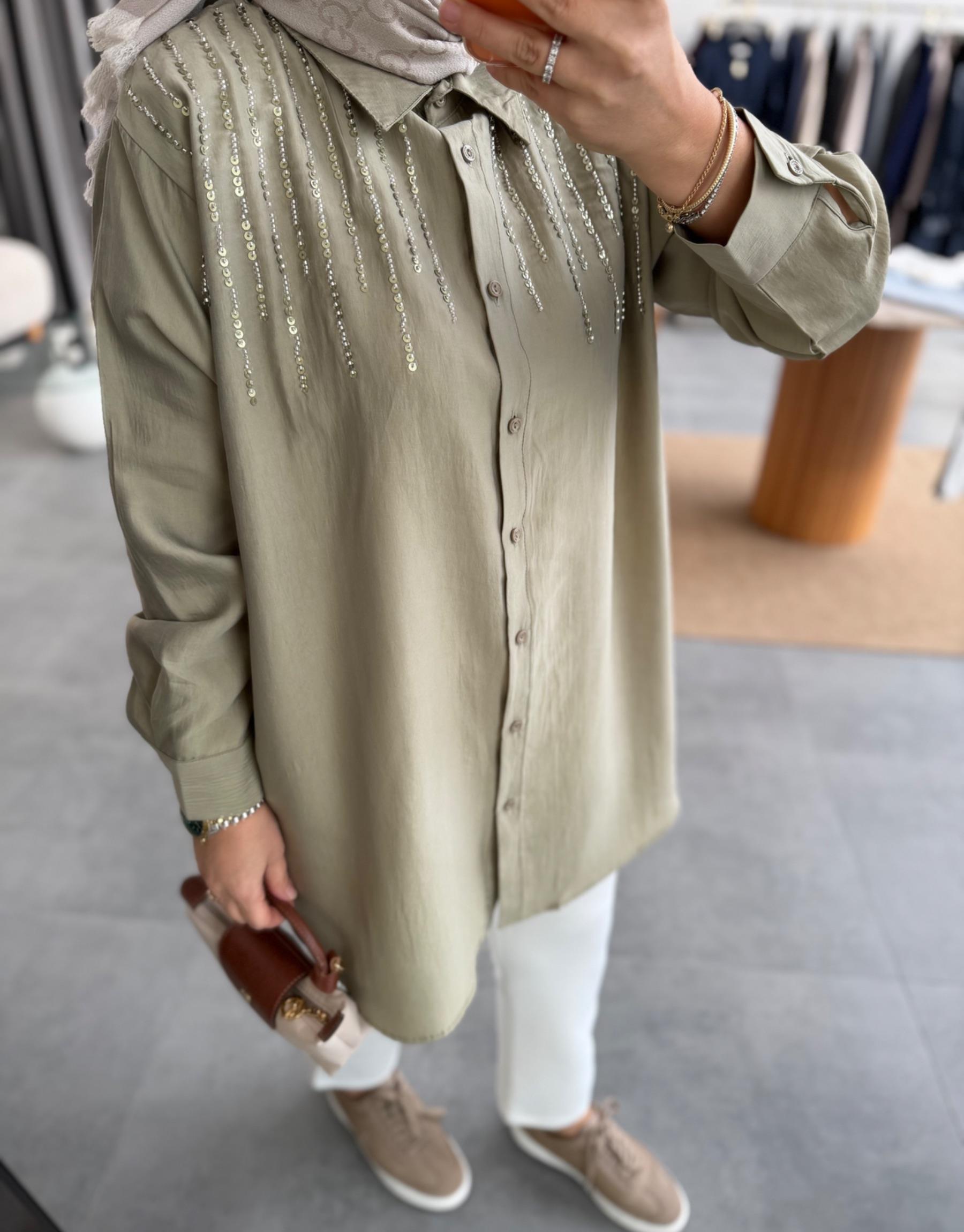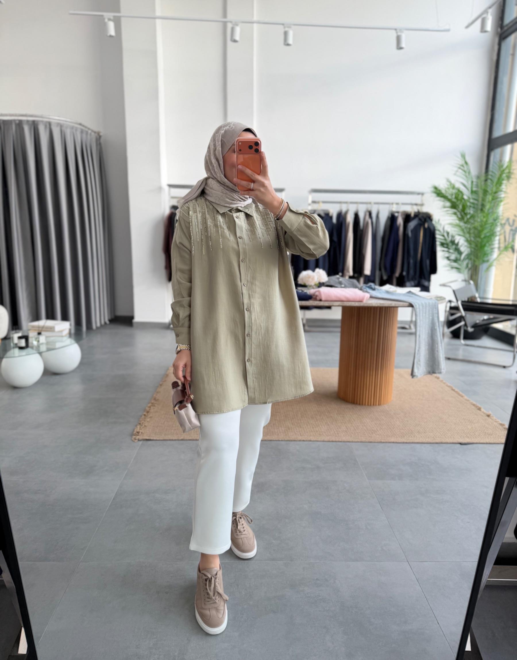 tesettur giyim Olive Boncuk İşlemeli Gömlek Butiköz