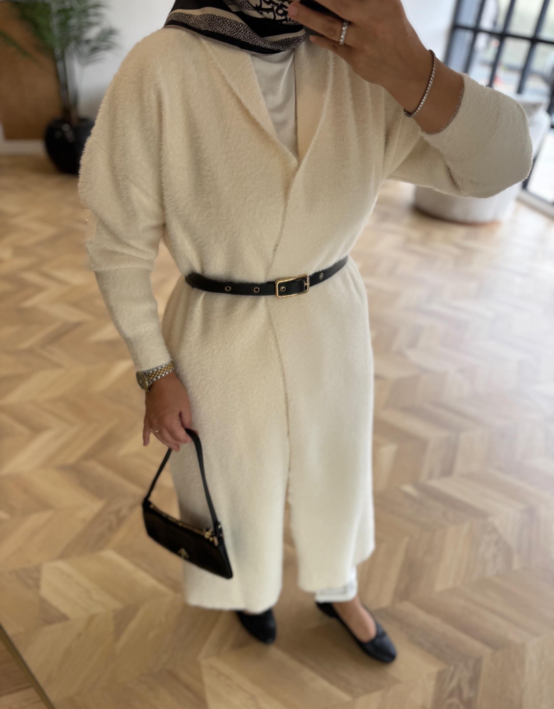 tesettur giyim Ekru Kemerli Angora Uzun Hırka Butiköz