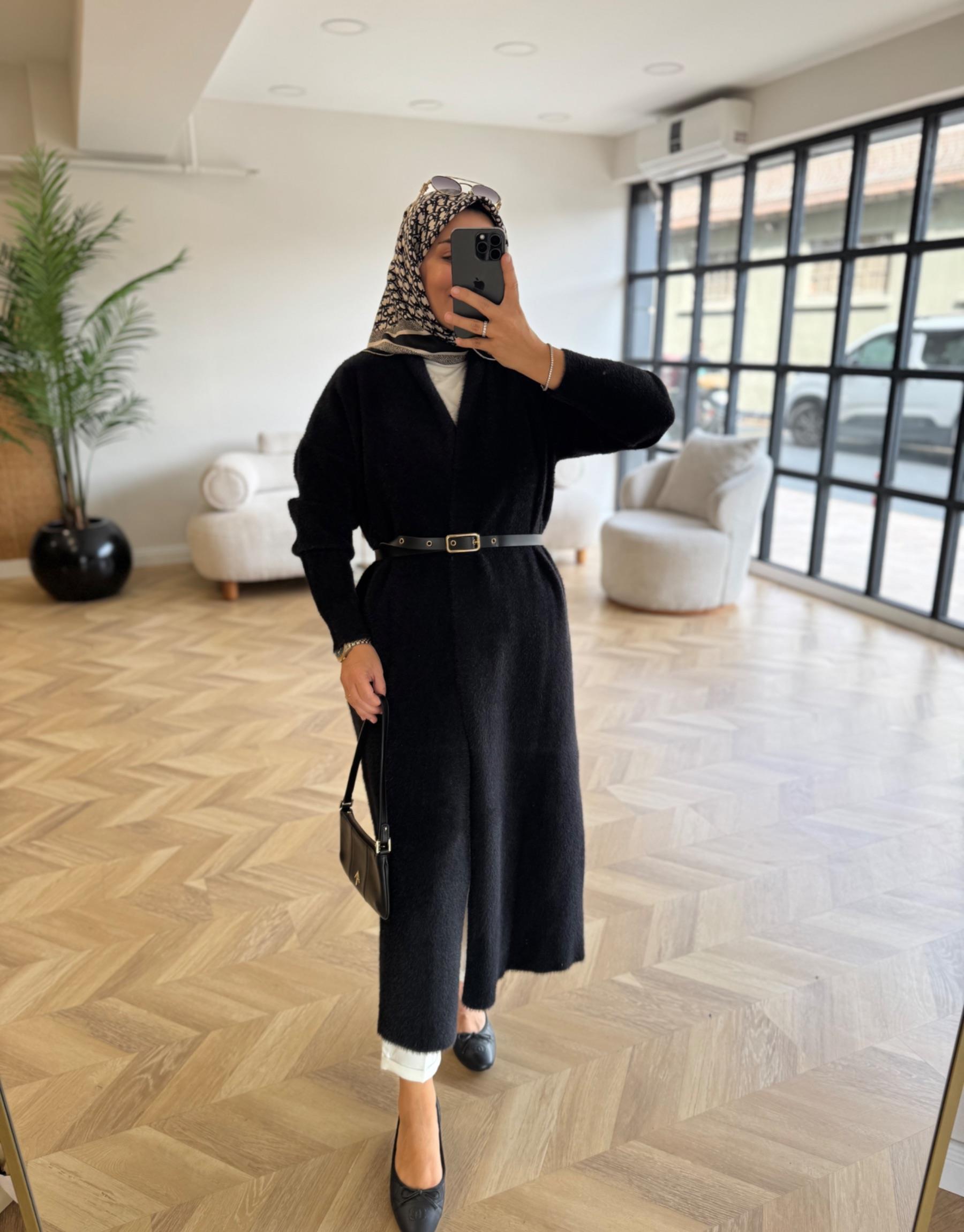 tesettur giyim Siyah Kemerli Angora Uzun Hırka Butiköz