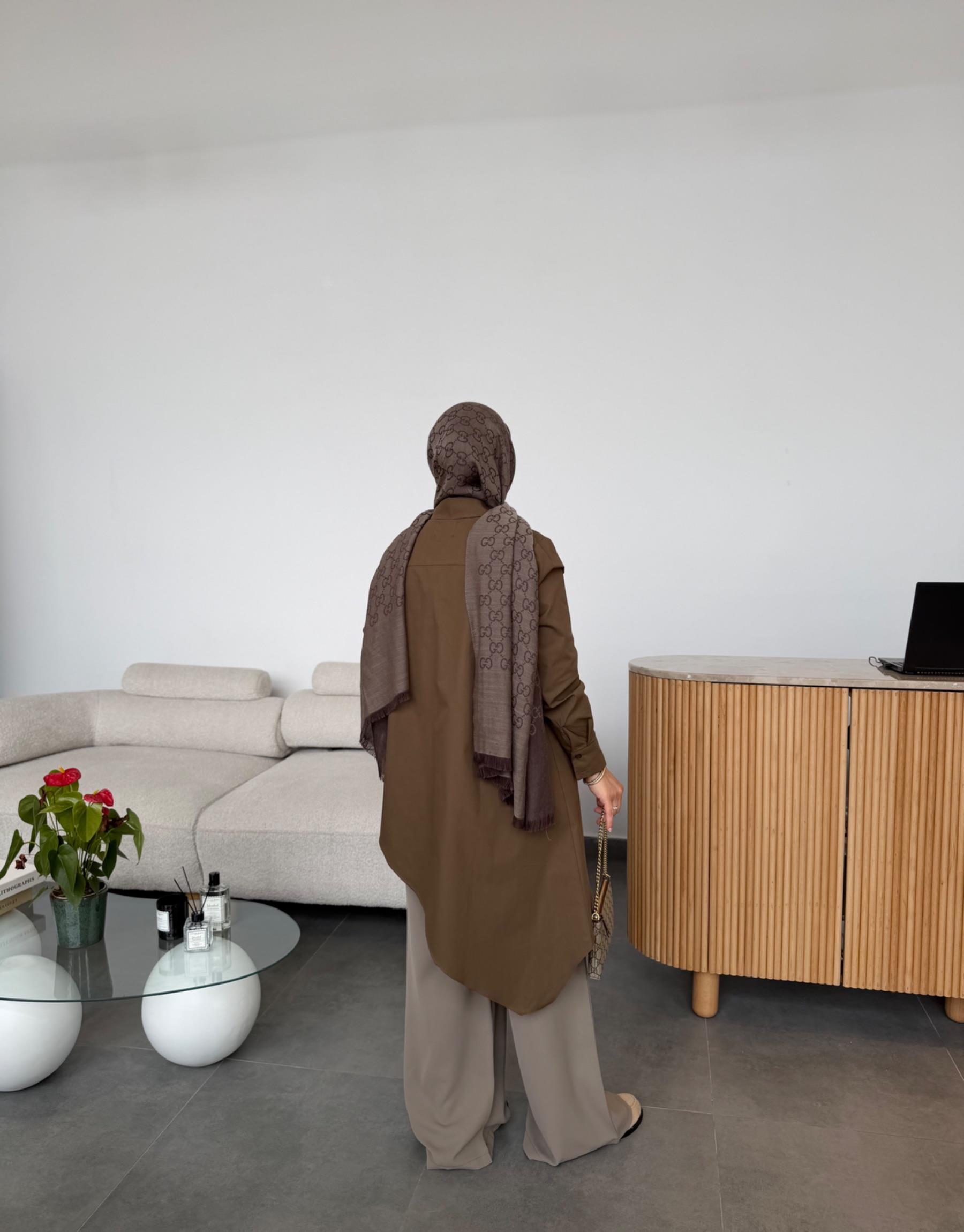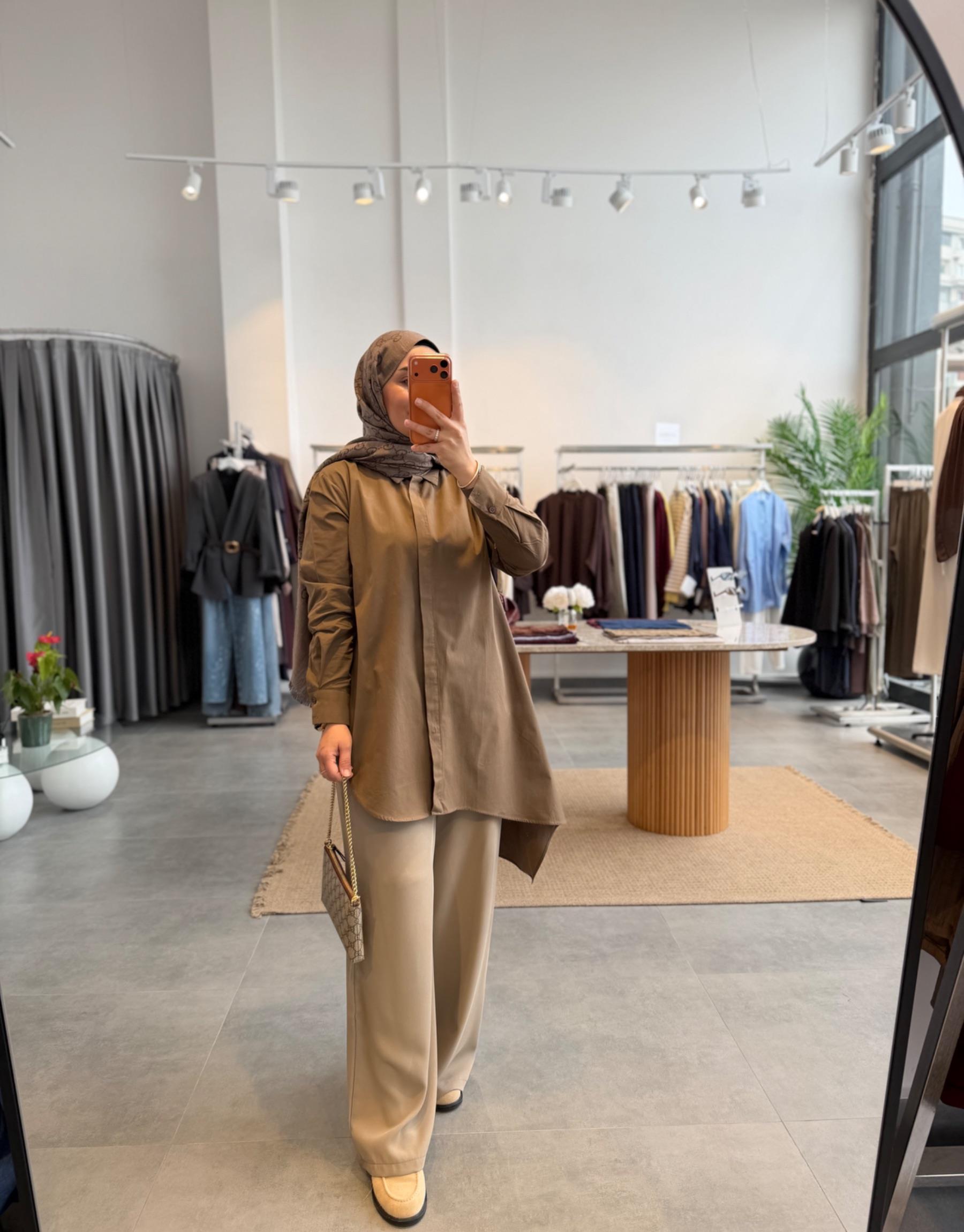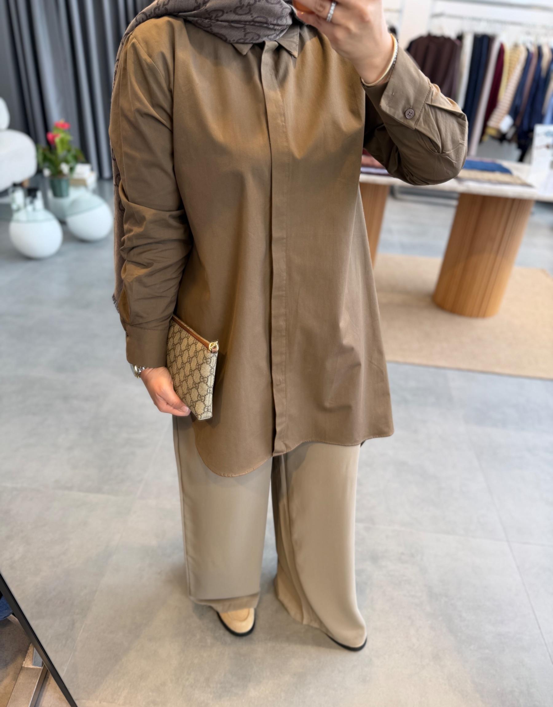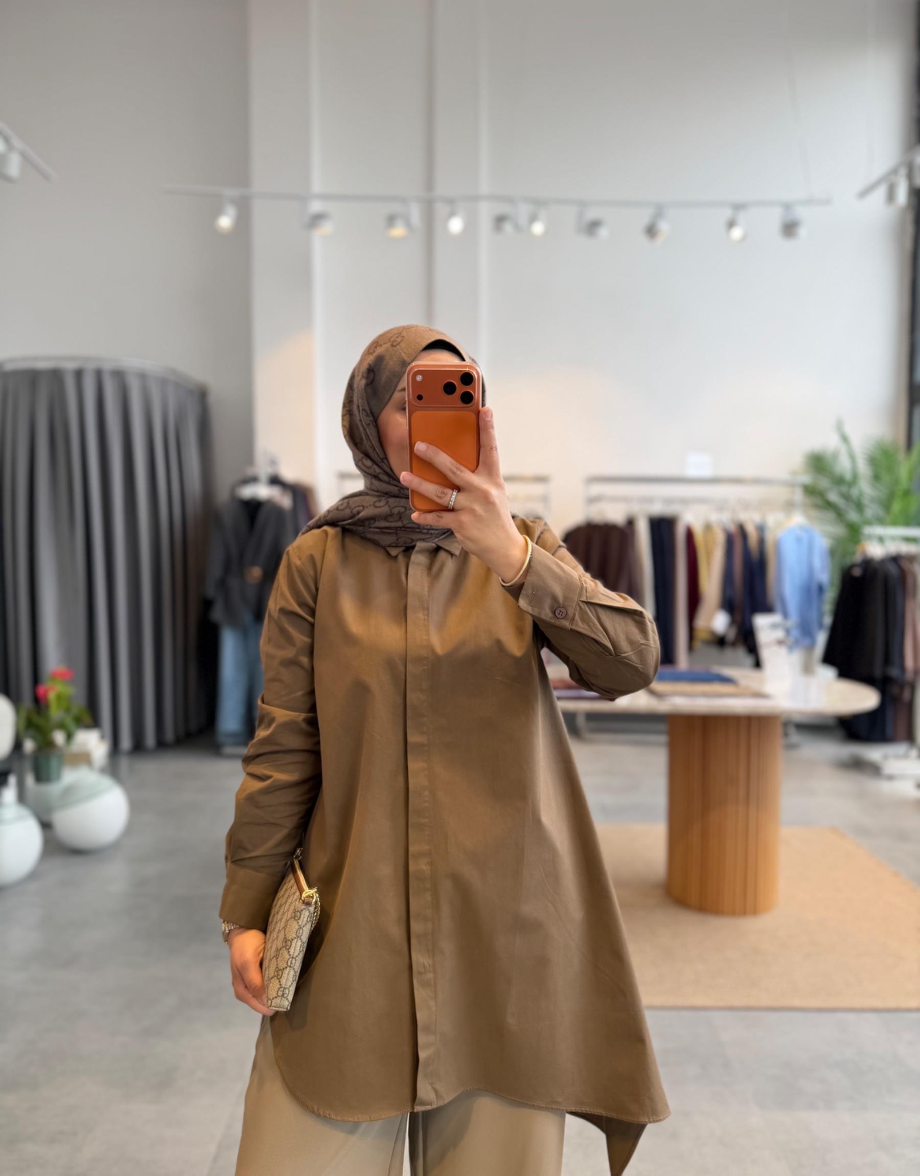 tesettur giyim Sütlü Kahve Asimetrik Kesim Gömlek Butiköz