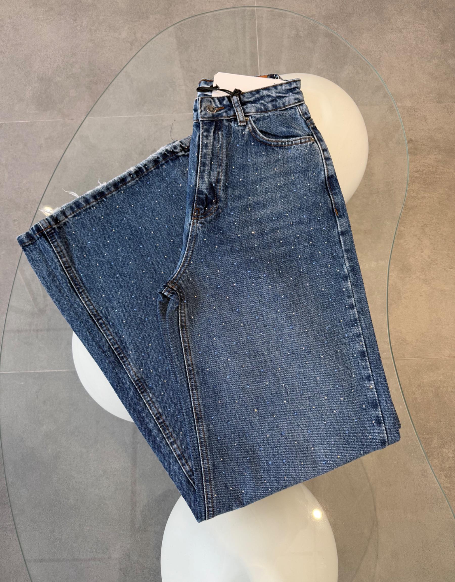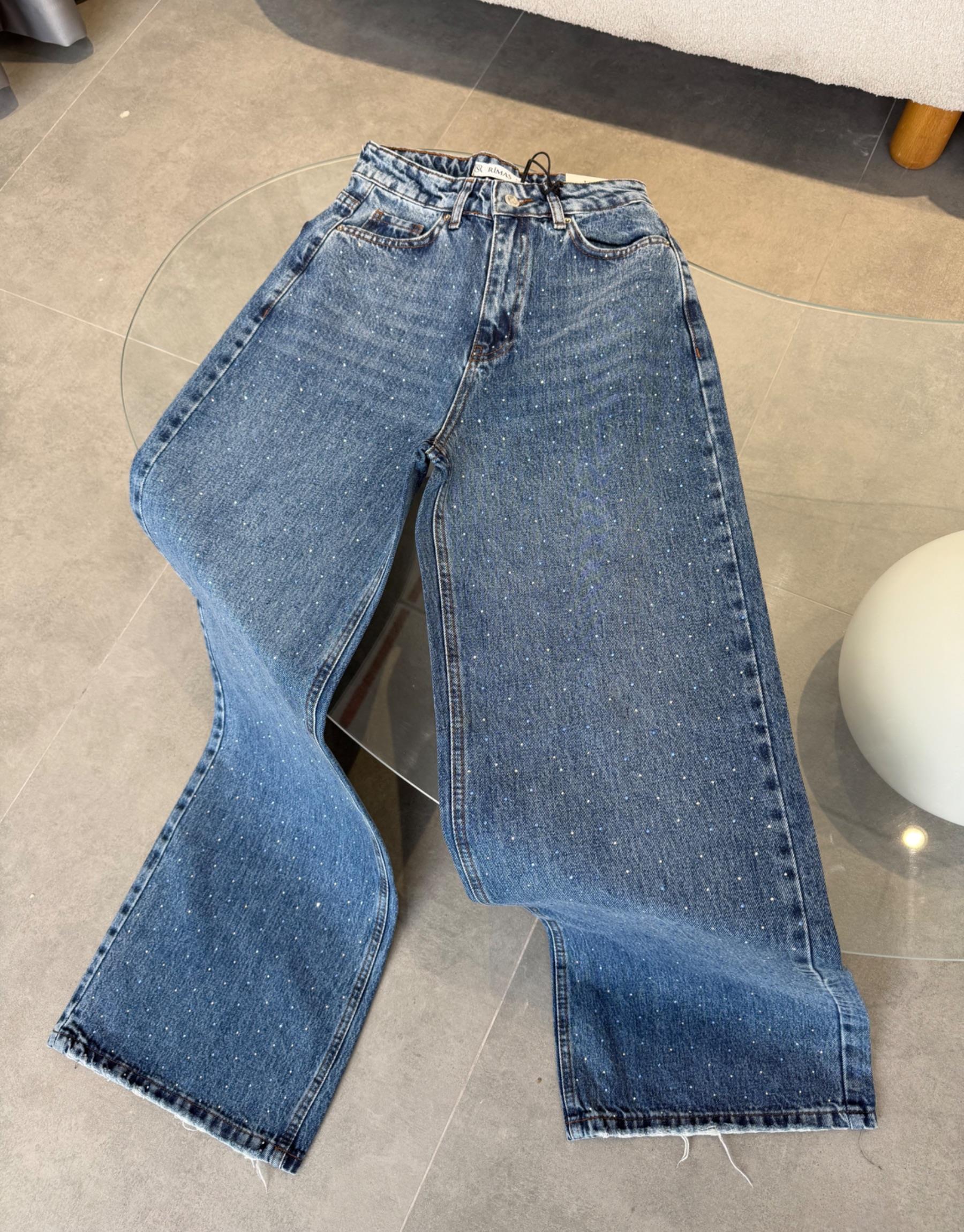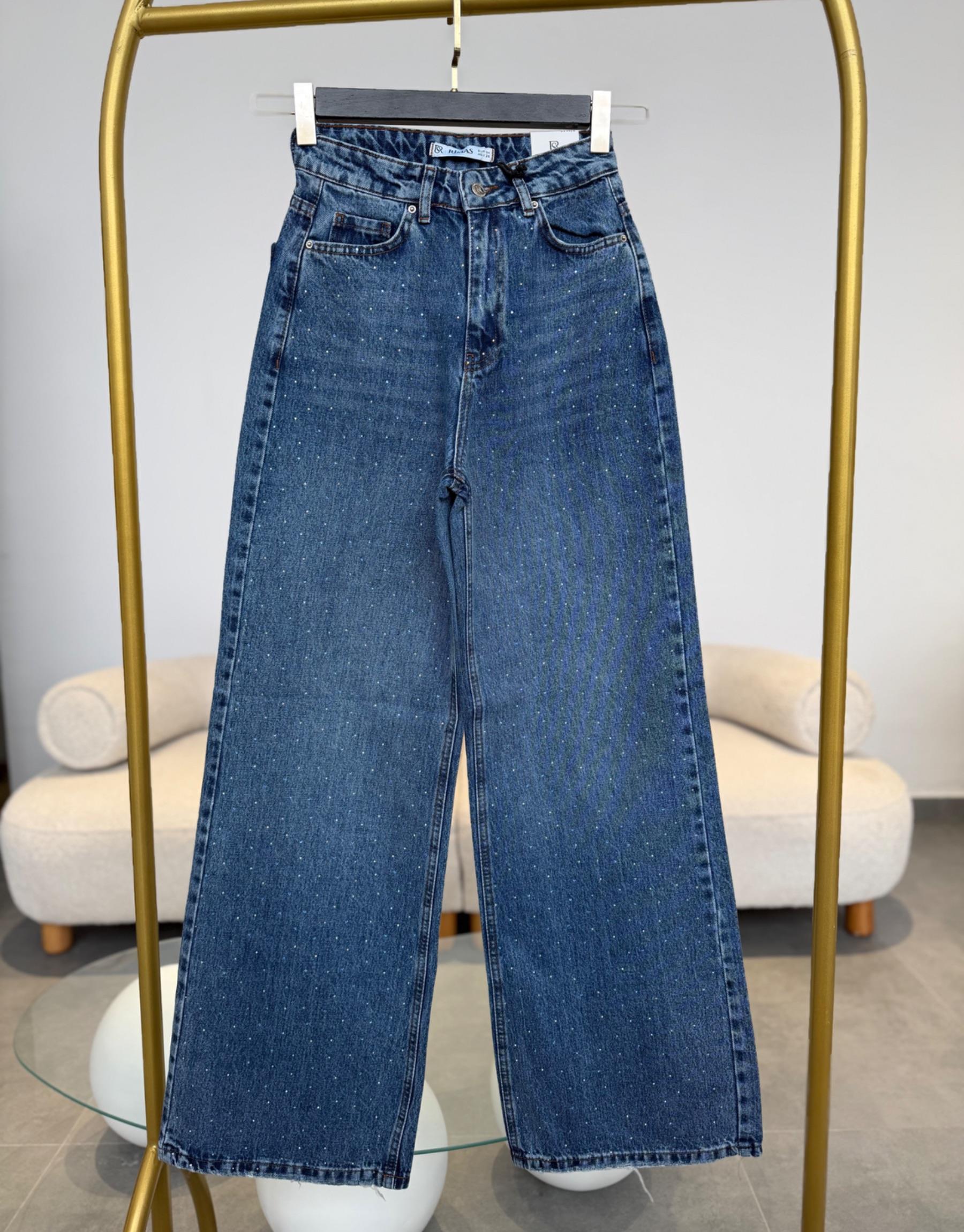 Mavi Kar Yıkama Serpme Taş Detaylı Wıde Leg Pantolon