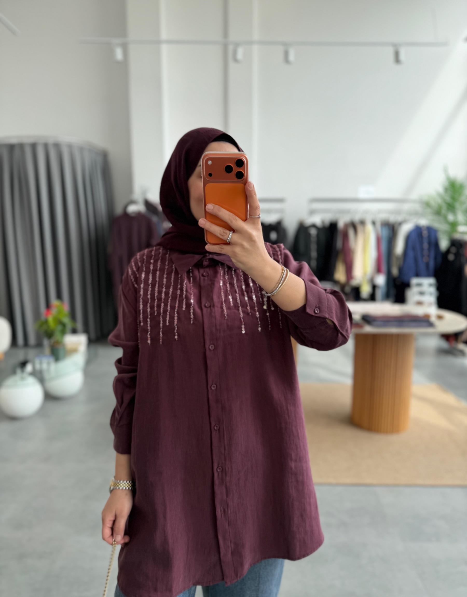 Kahve Birit Detaylı Poplin Gömlek