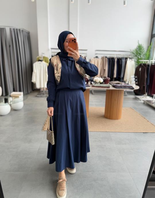 Lacivert Eşarplı Etekli Takım