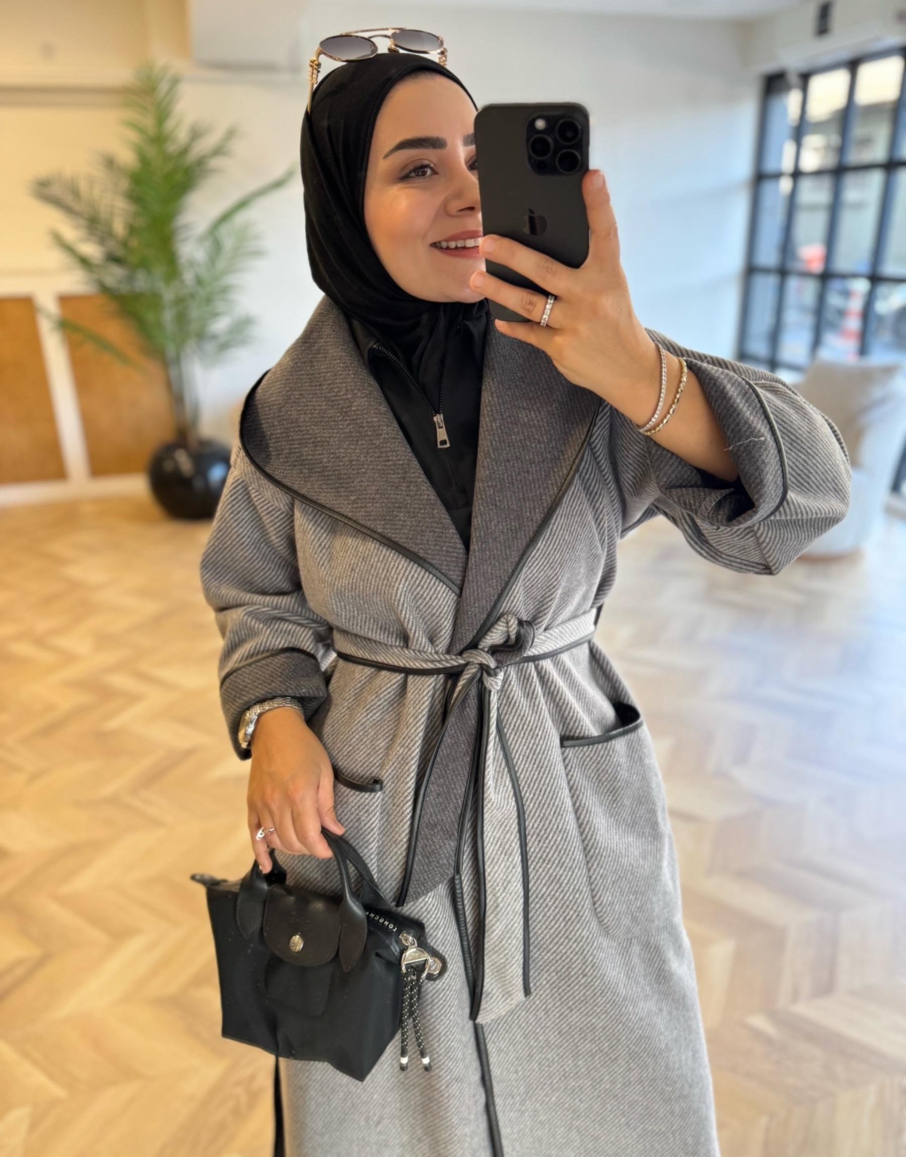 tesettur giyim Gri Kapşonlu Palermo Kaban Butiköz