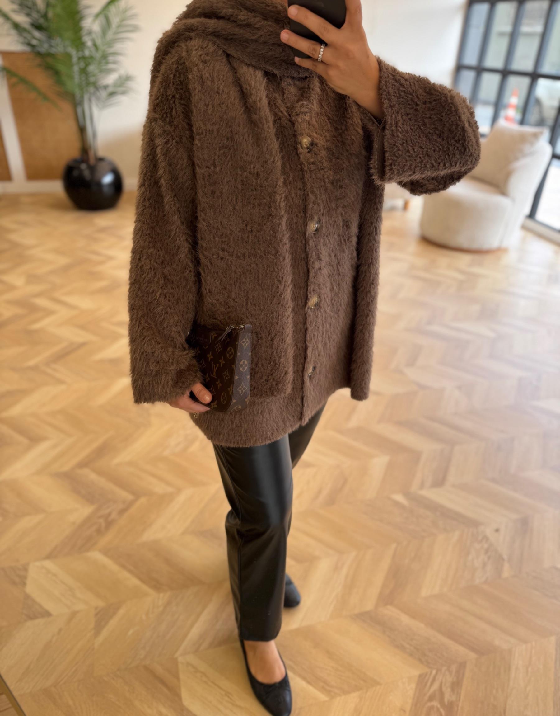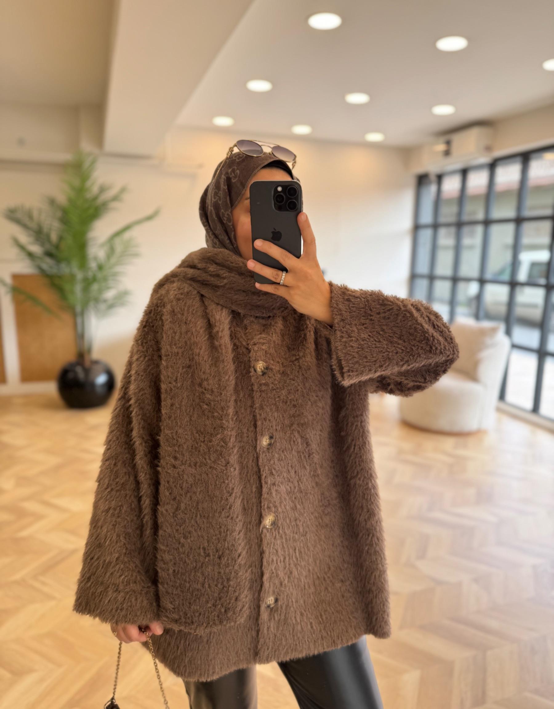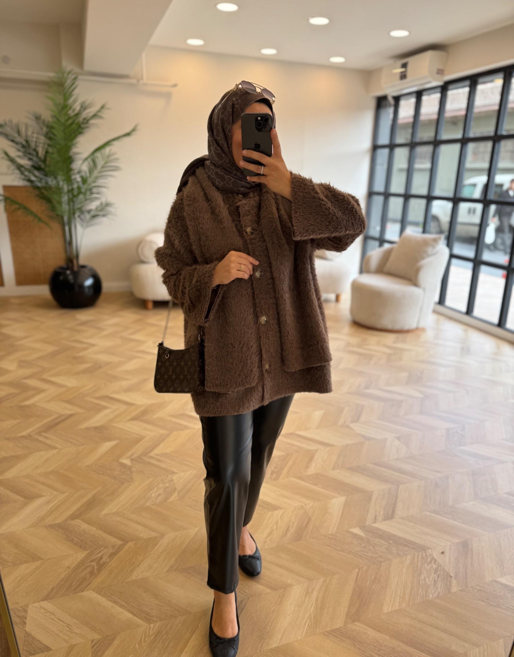 tesettur giyim Kahve Atkı Detaylı Sakallı Triko Ceket Butiköz