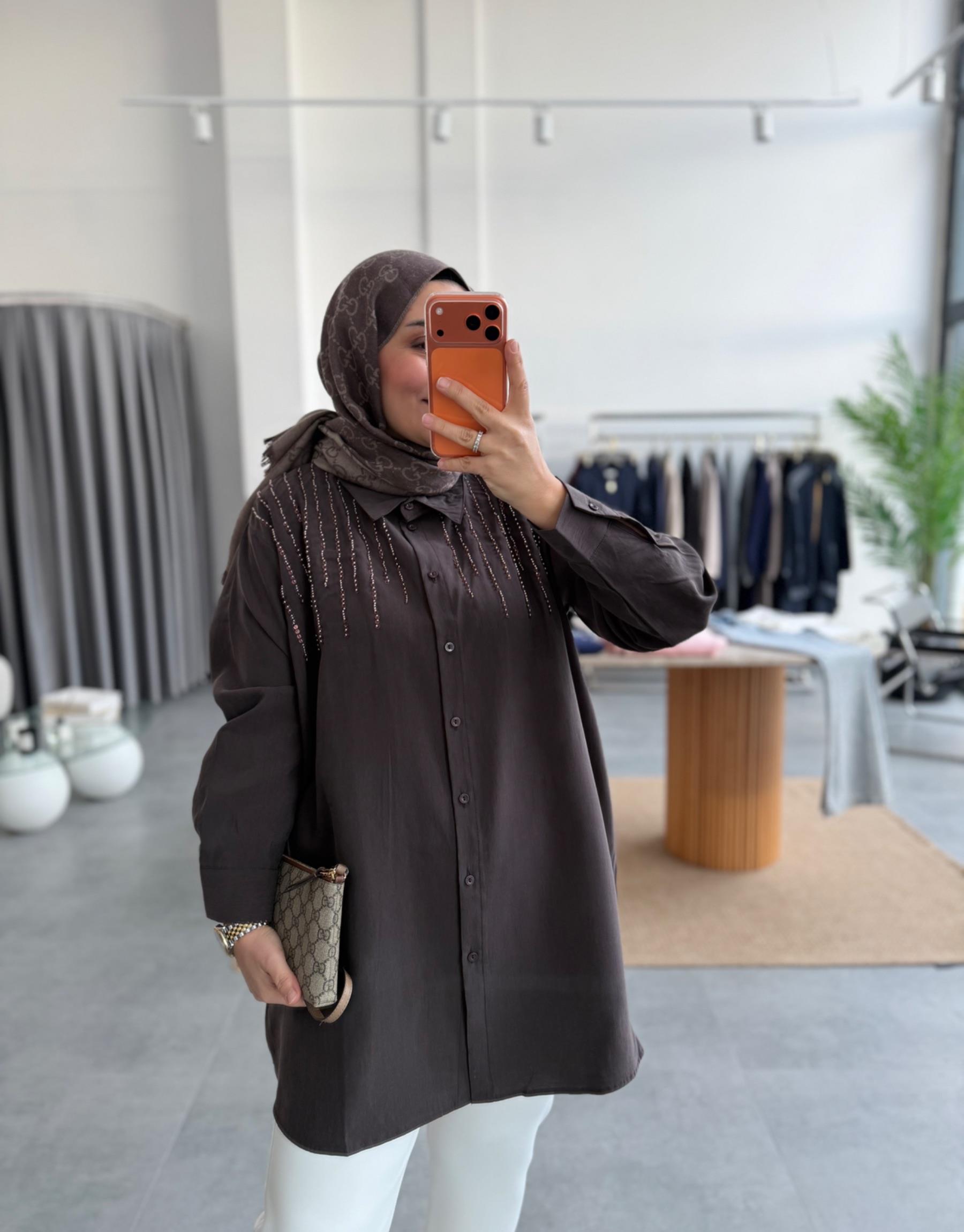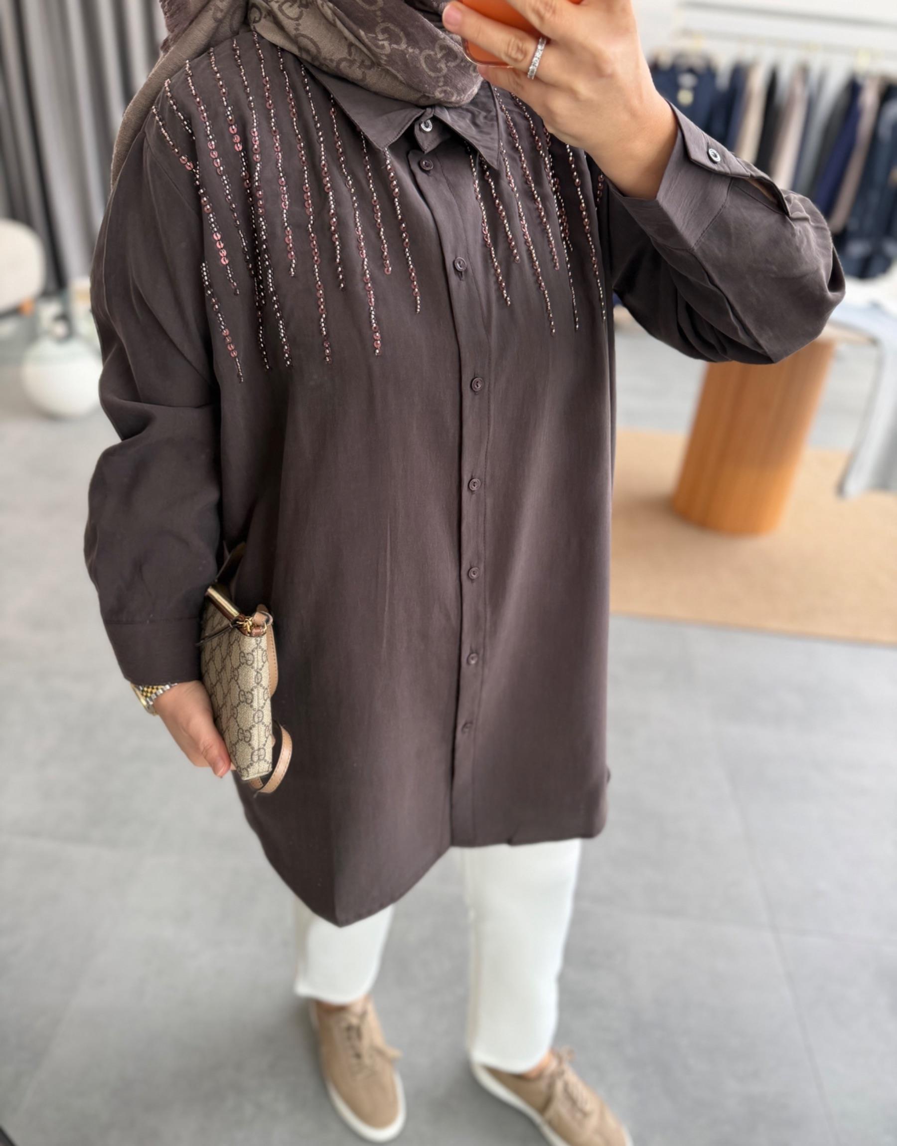 tesettur giyim Kahve Boncuk İşlemeli Gömlek Butiköz