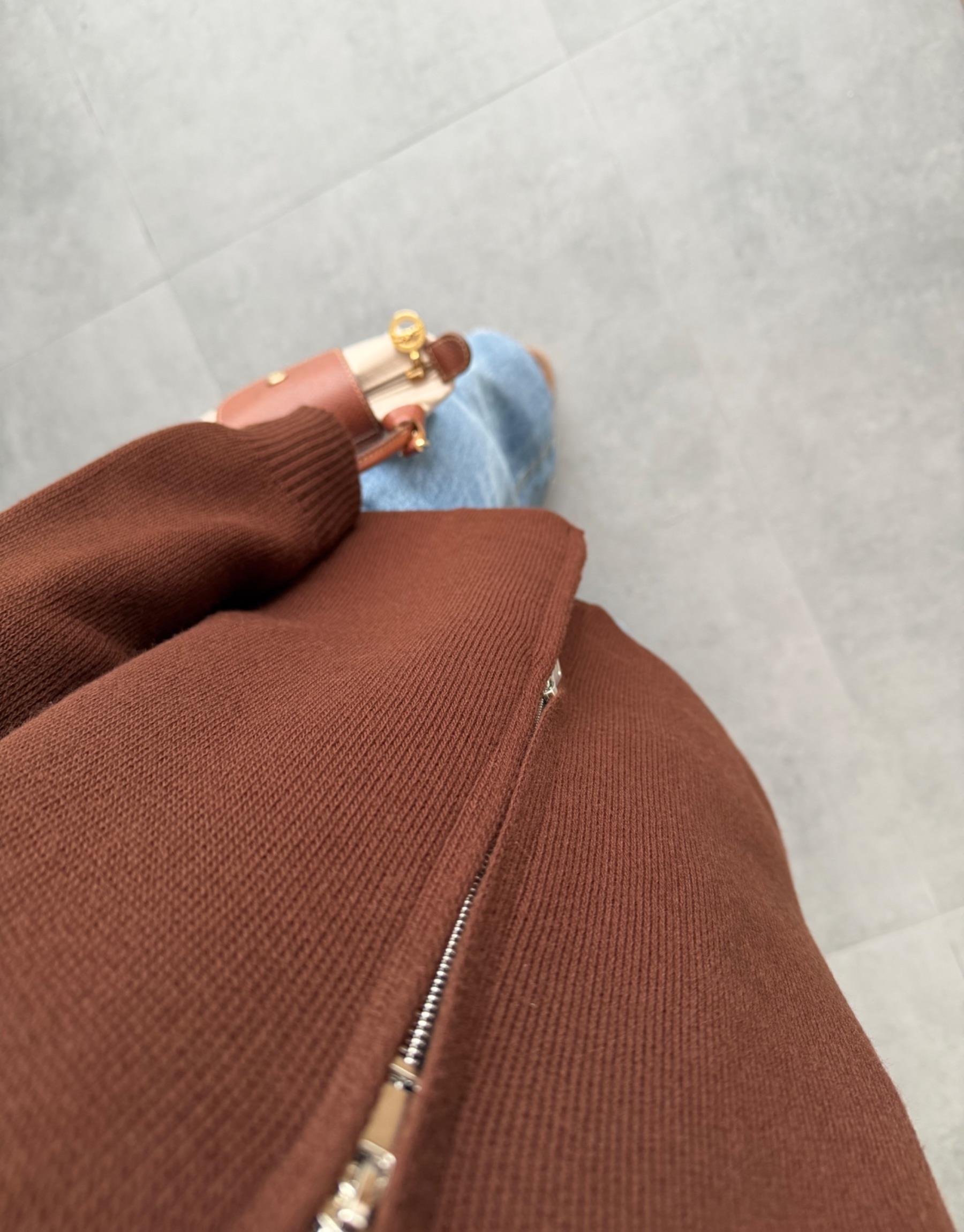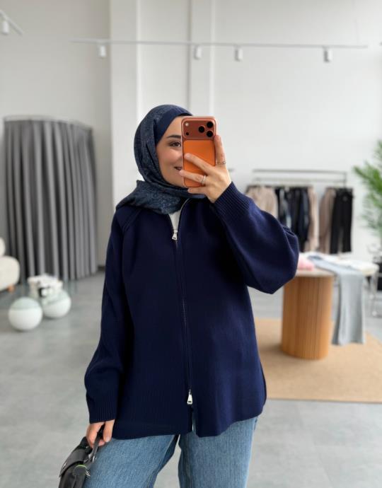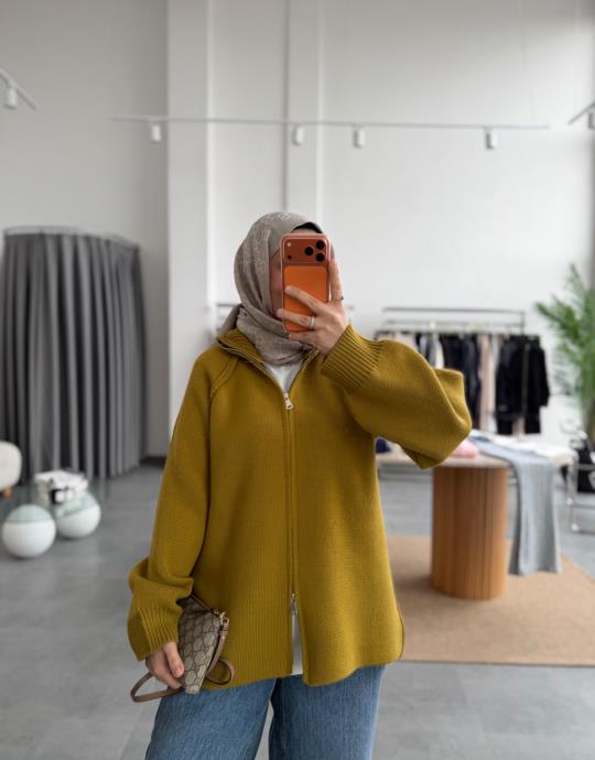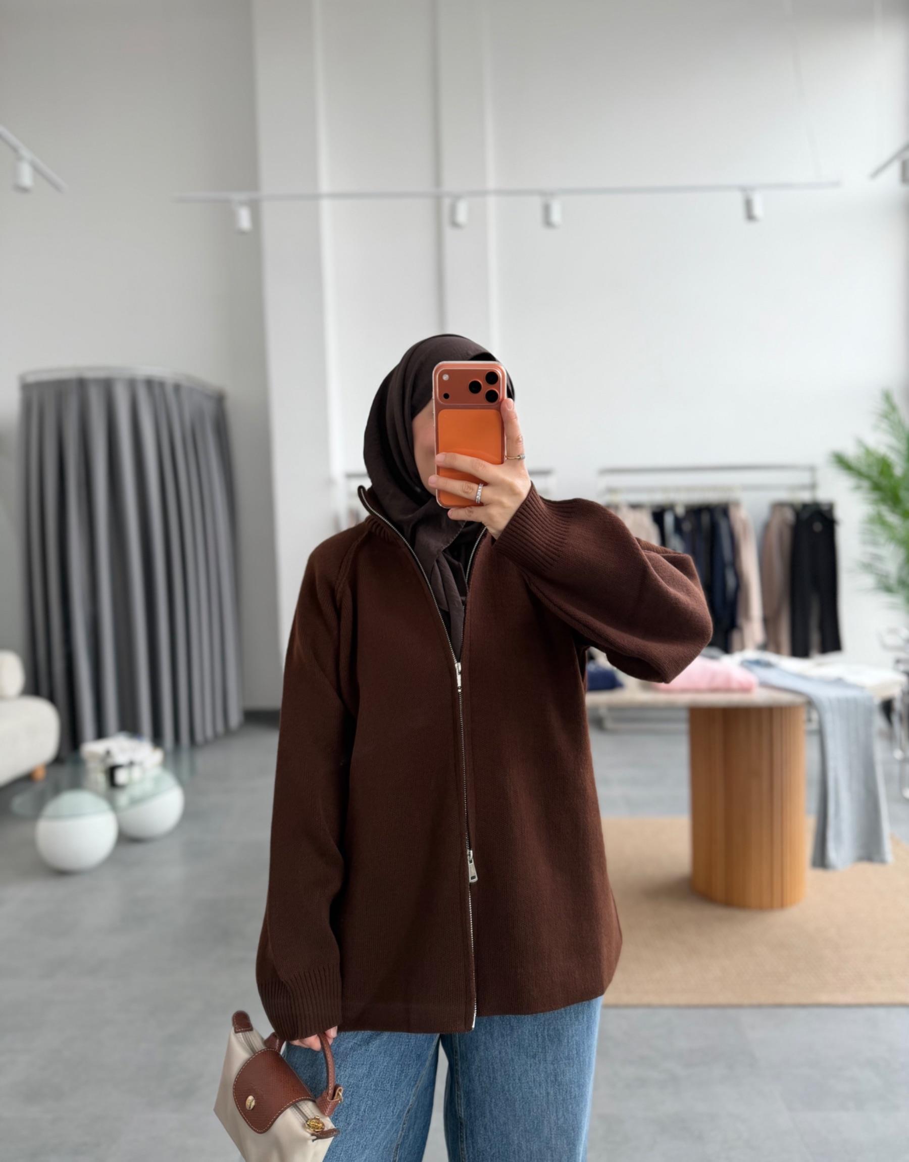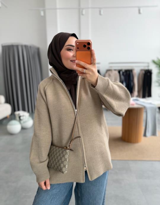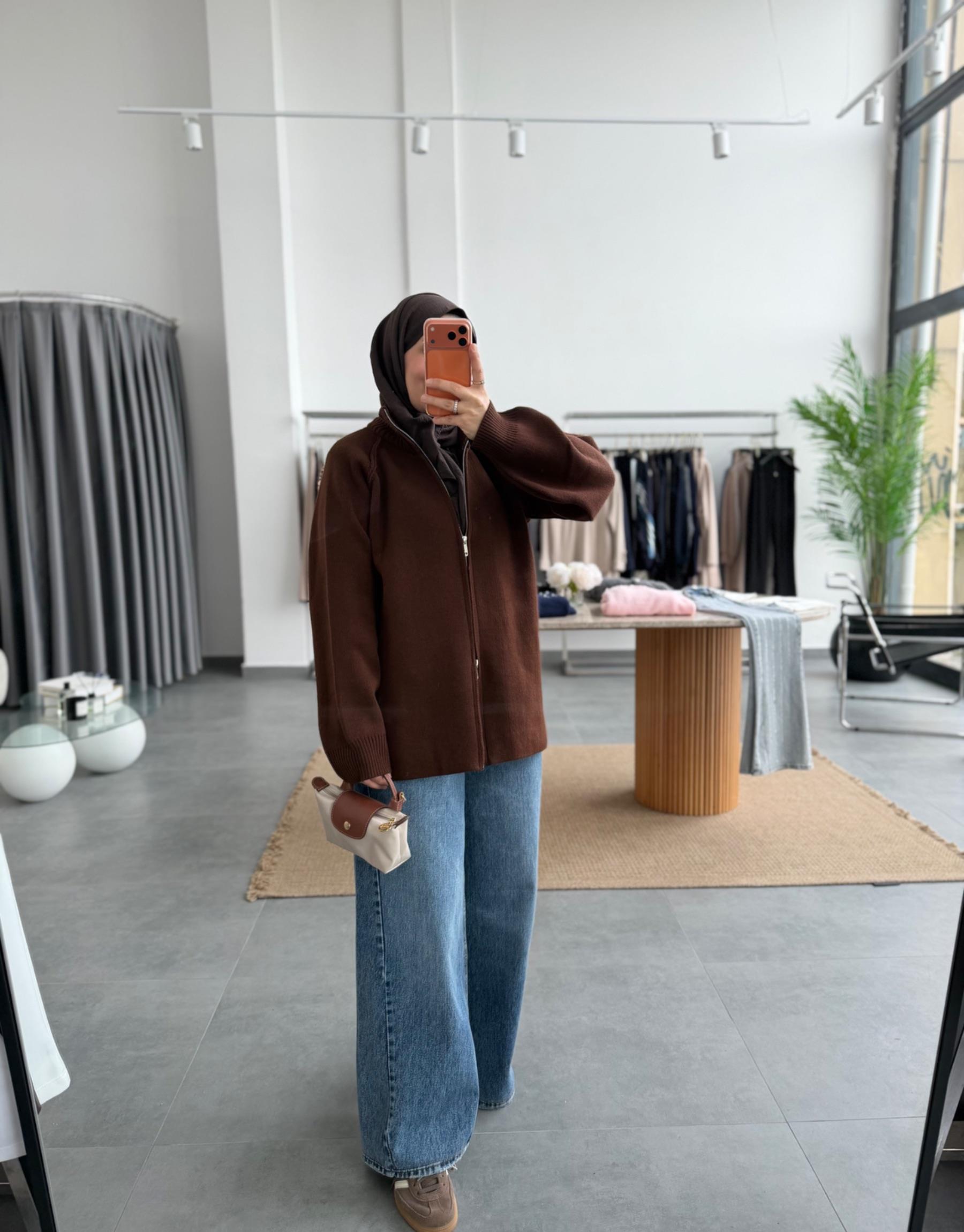 tesettur giyim Kahve Çift Fermuarlı Triko Hırka Butiköz