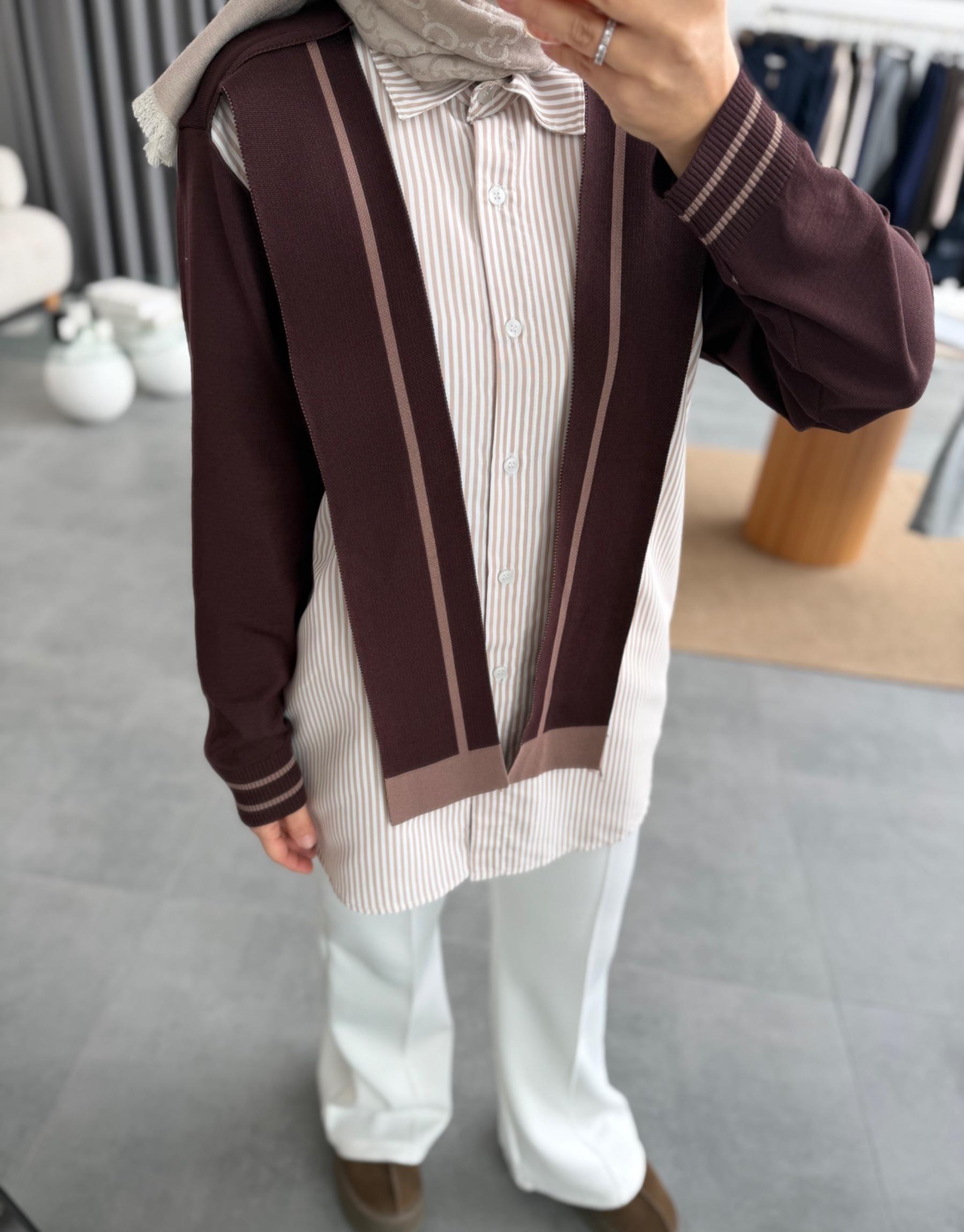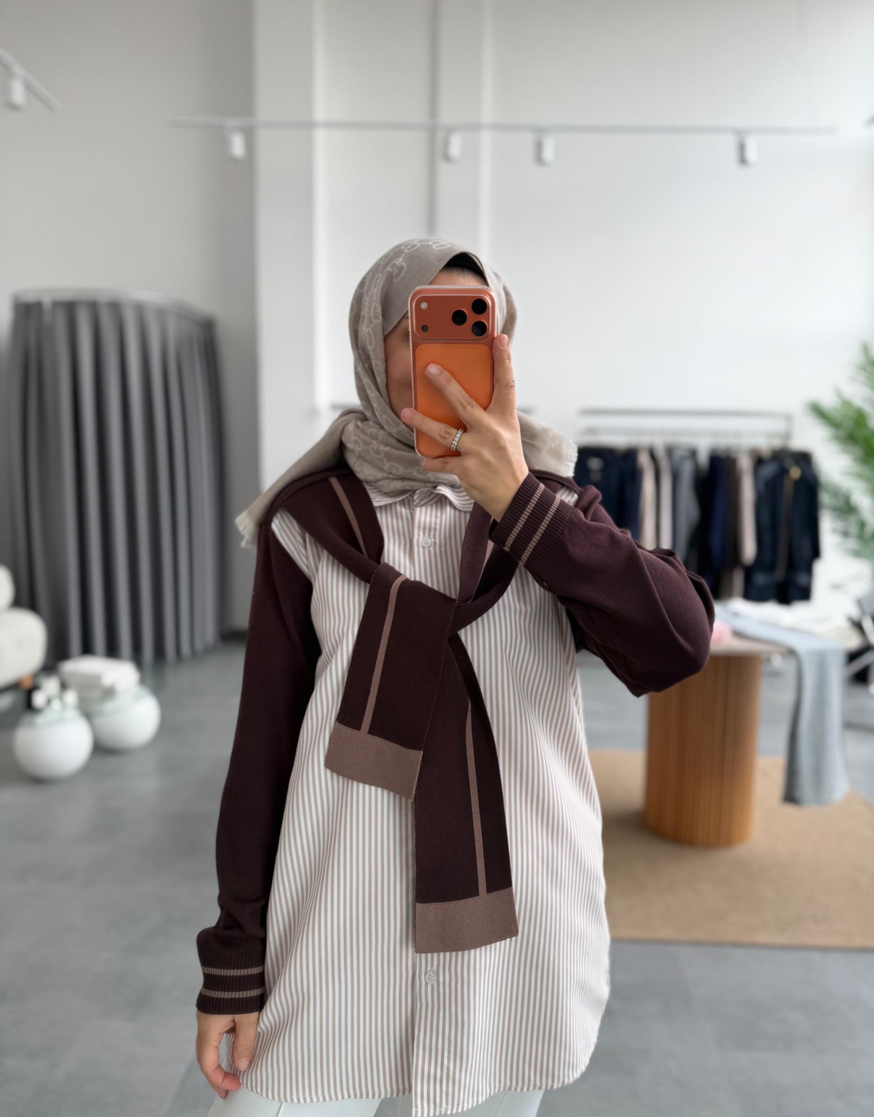 Kahve Gömlek Detaylı Triko Kazak