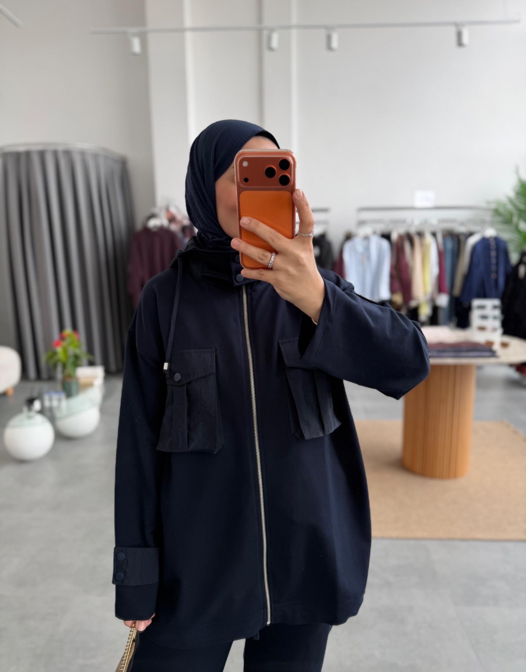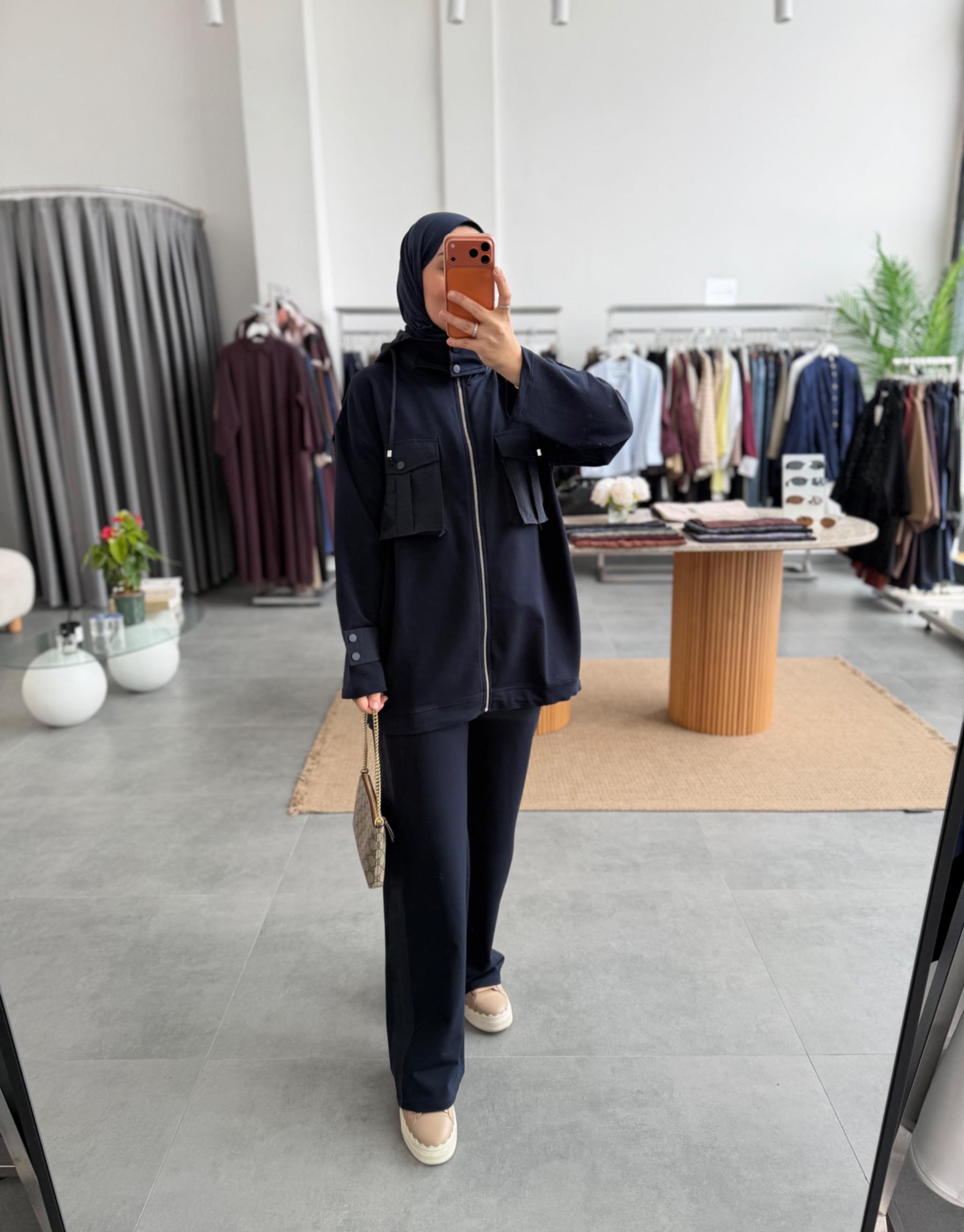 tesettur giyim Lacivert Cepli Garni Detaylı Takım Butiköz
