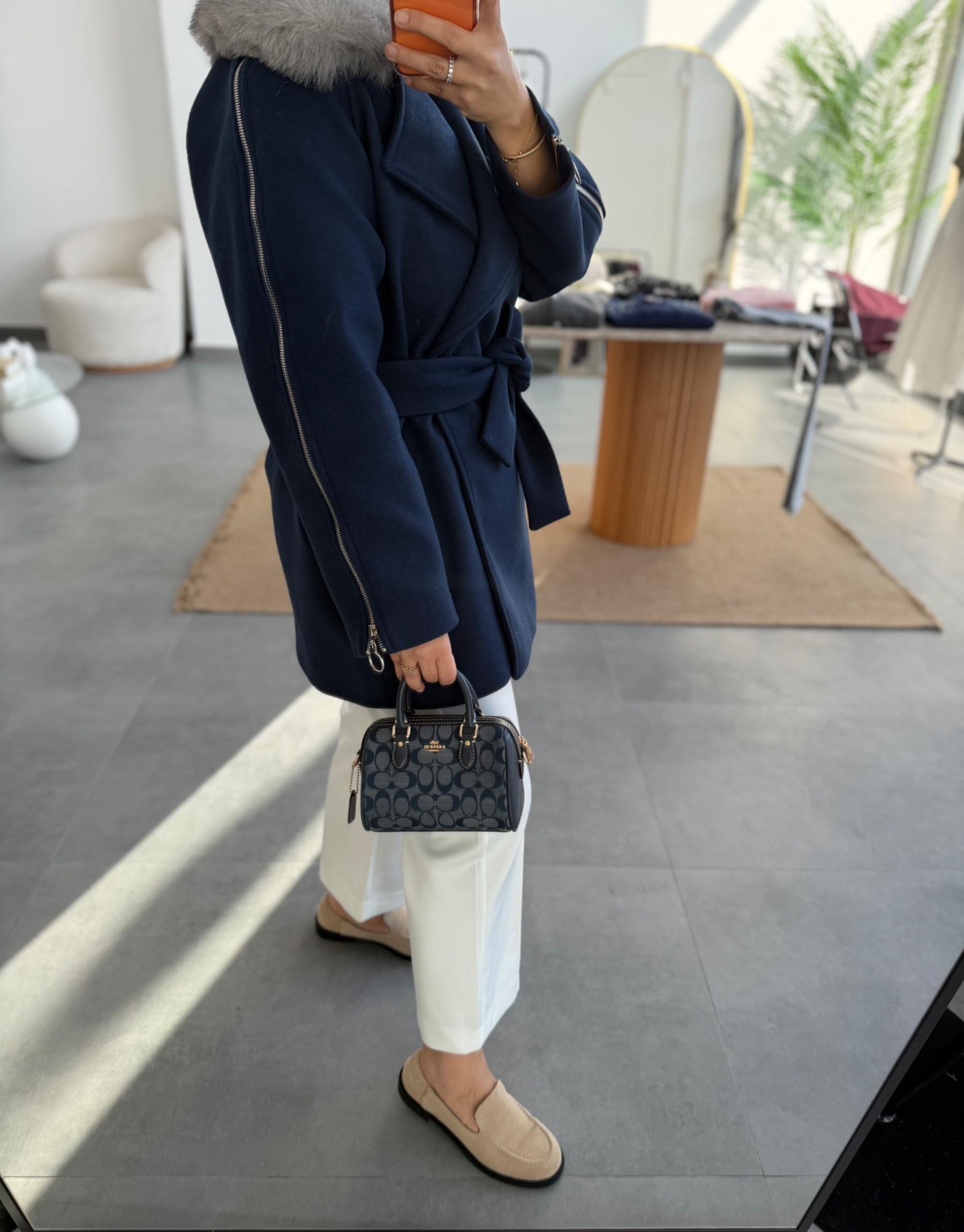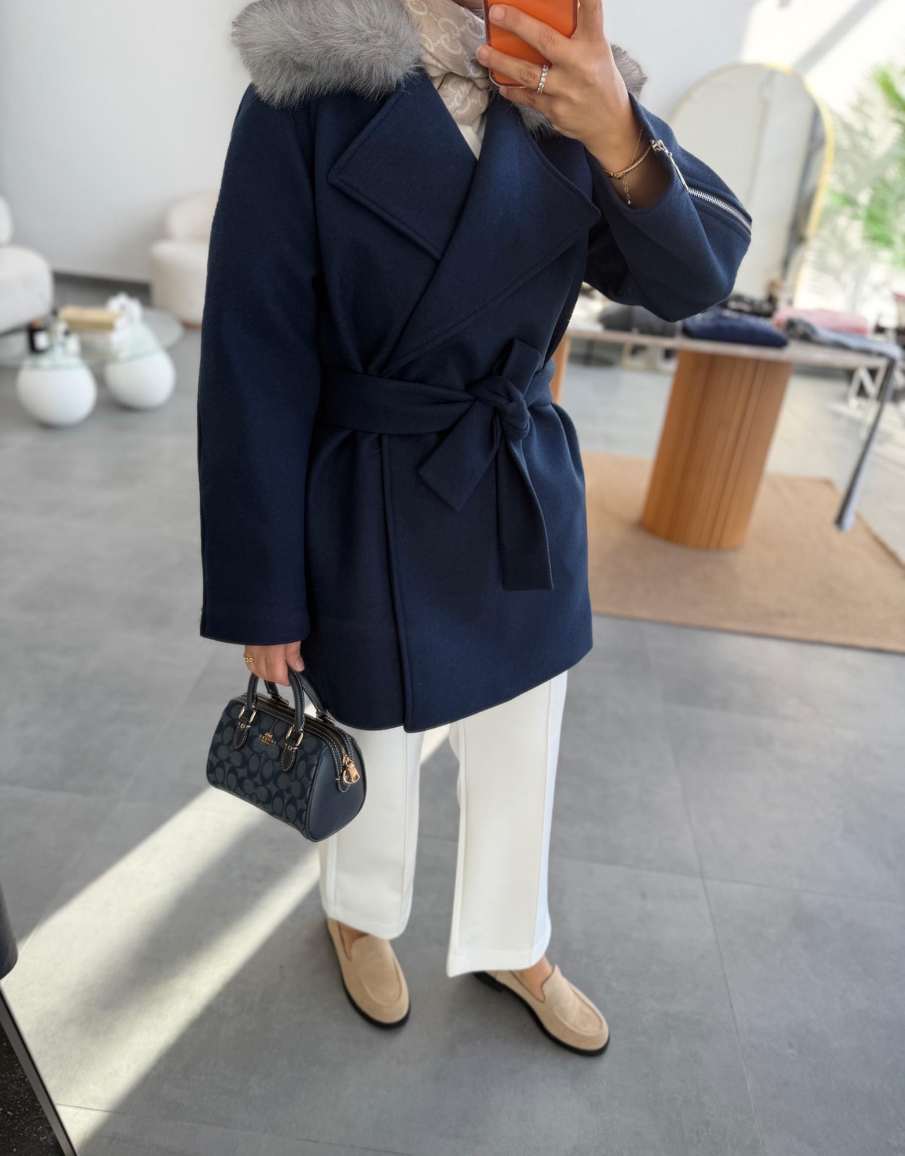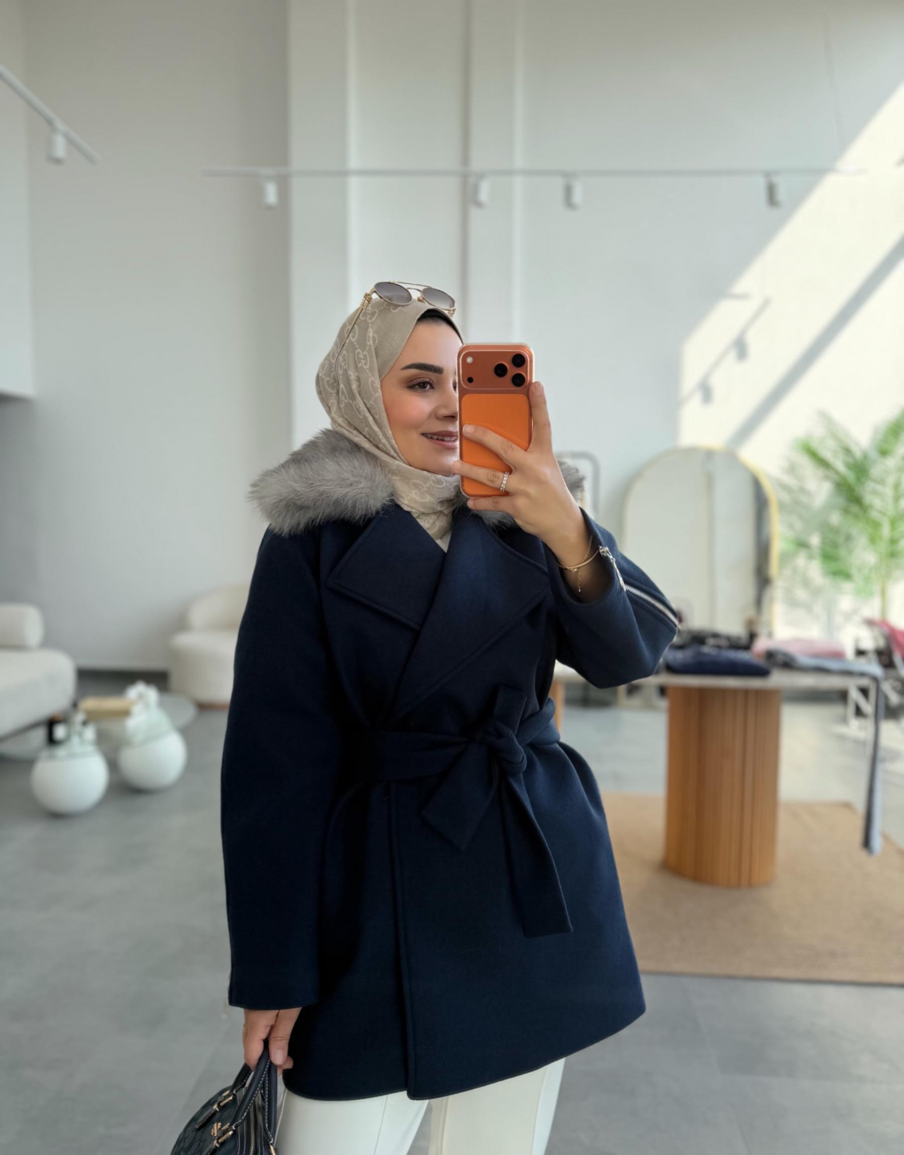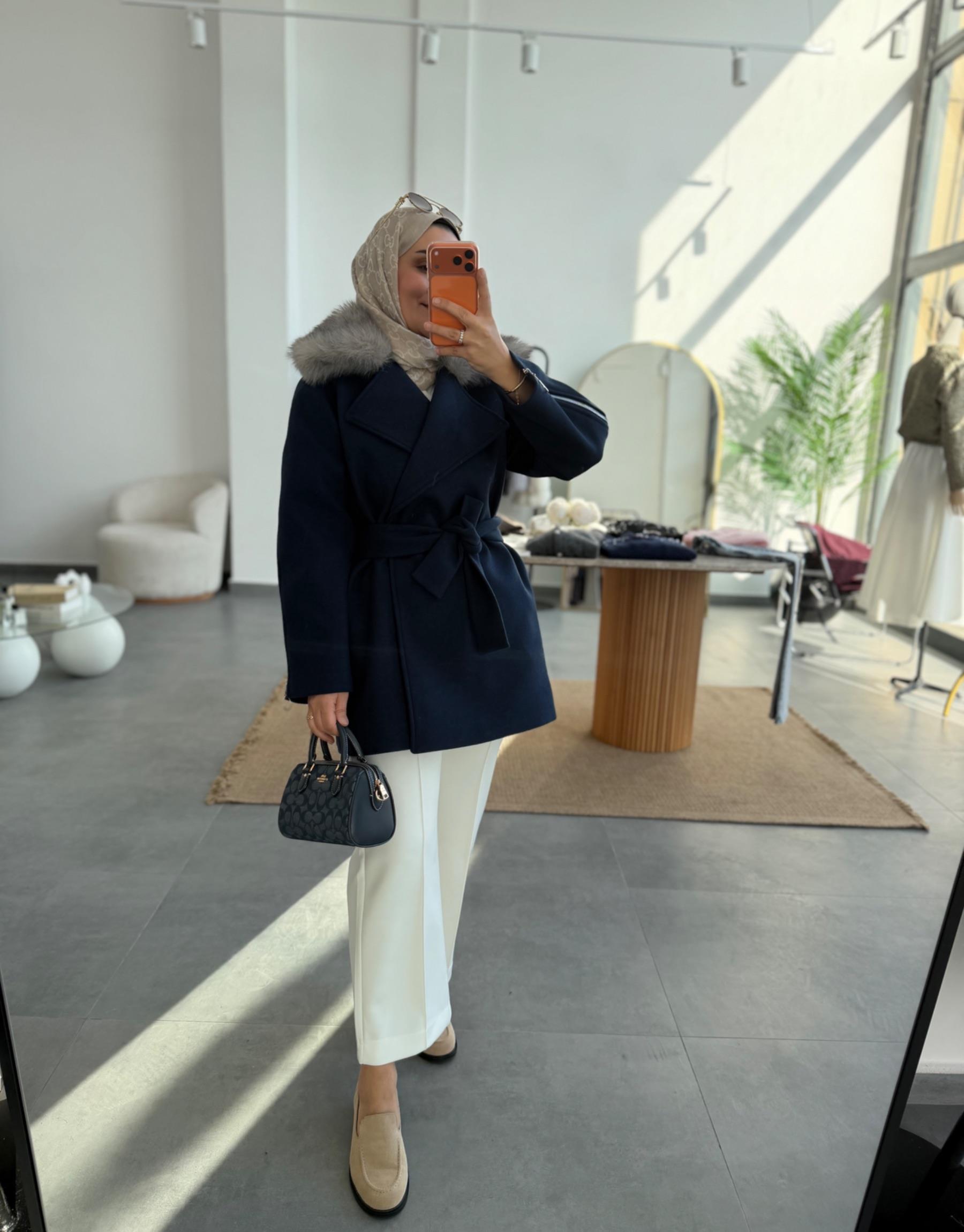 tesettur giyim Lacivert Fermuar Detaylı Yakası Kürklü Premium Kaban Butiköz