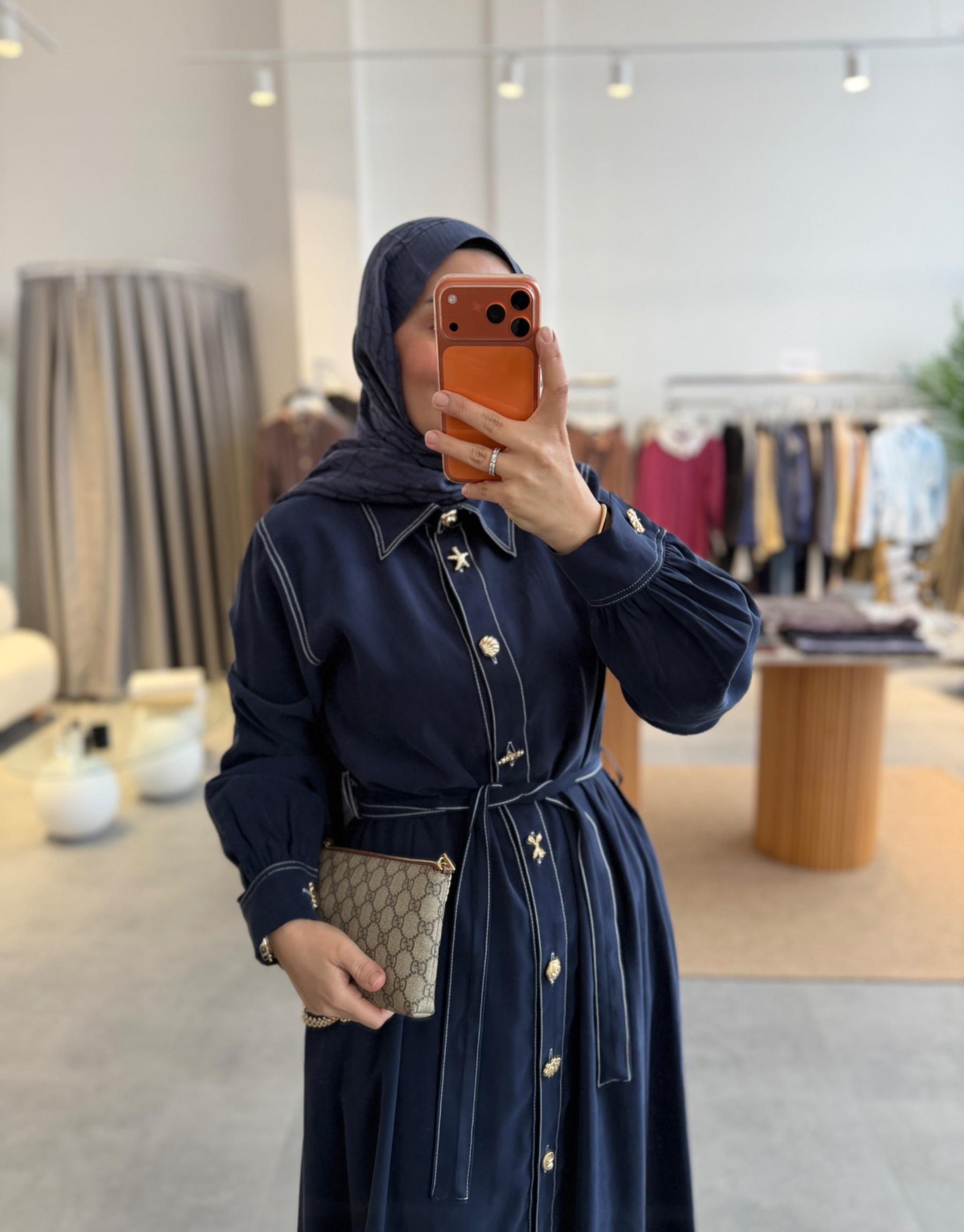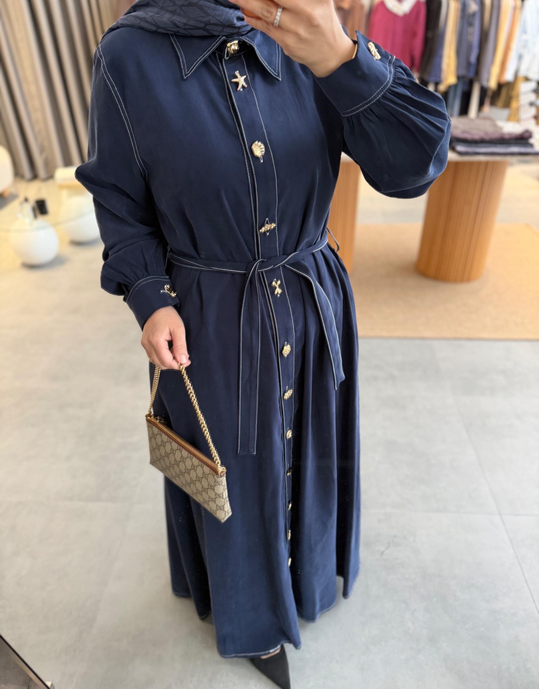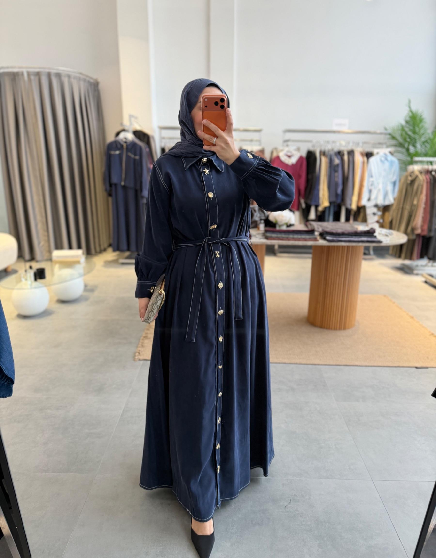 tesettur giyim Lacivert Gold Düğmeli Tensel Elbise Butiköz