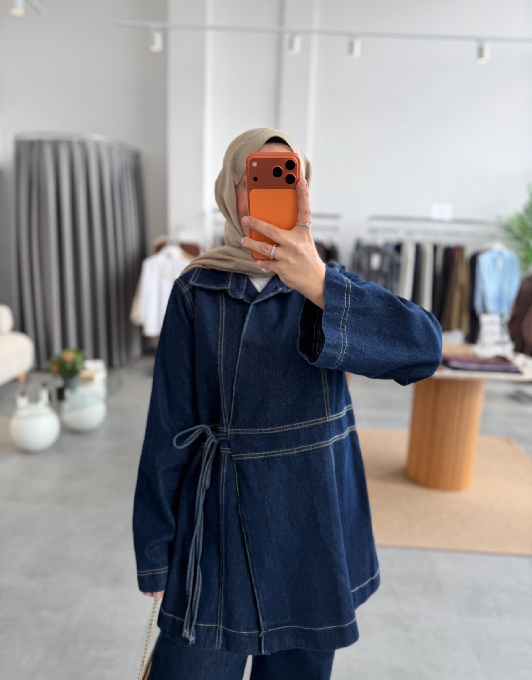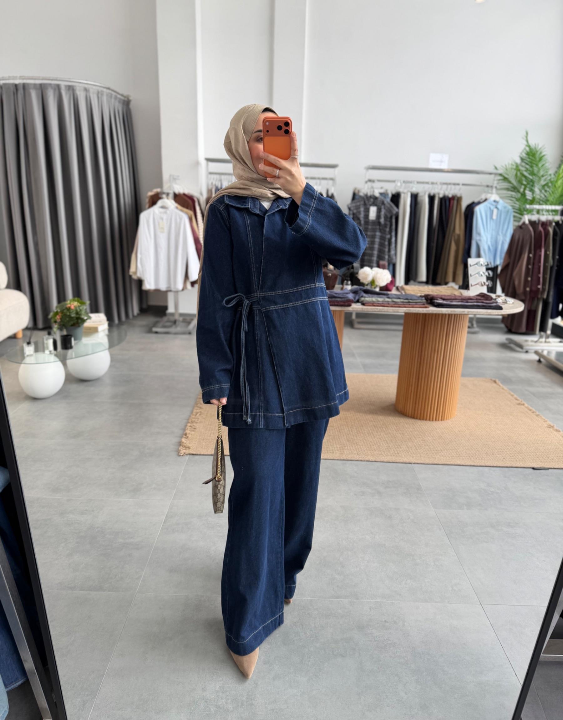 tesettur giyim Lacivert Kuruvaze Bağlamalı Denim Takım Butiköz
