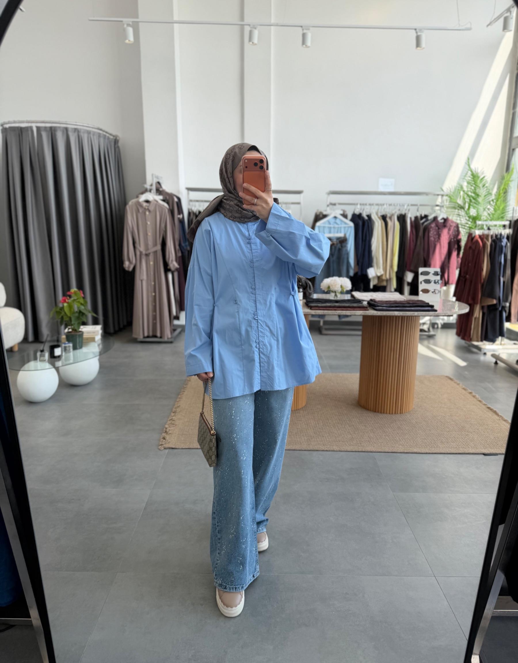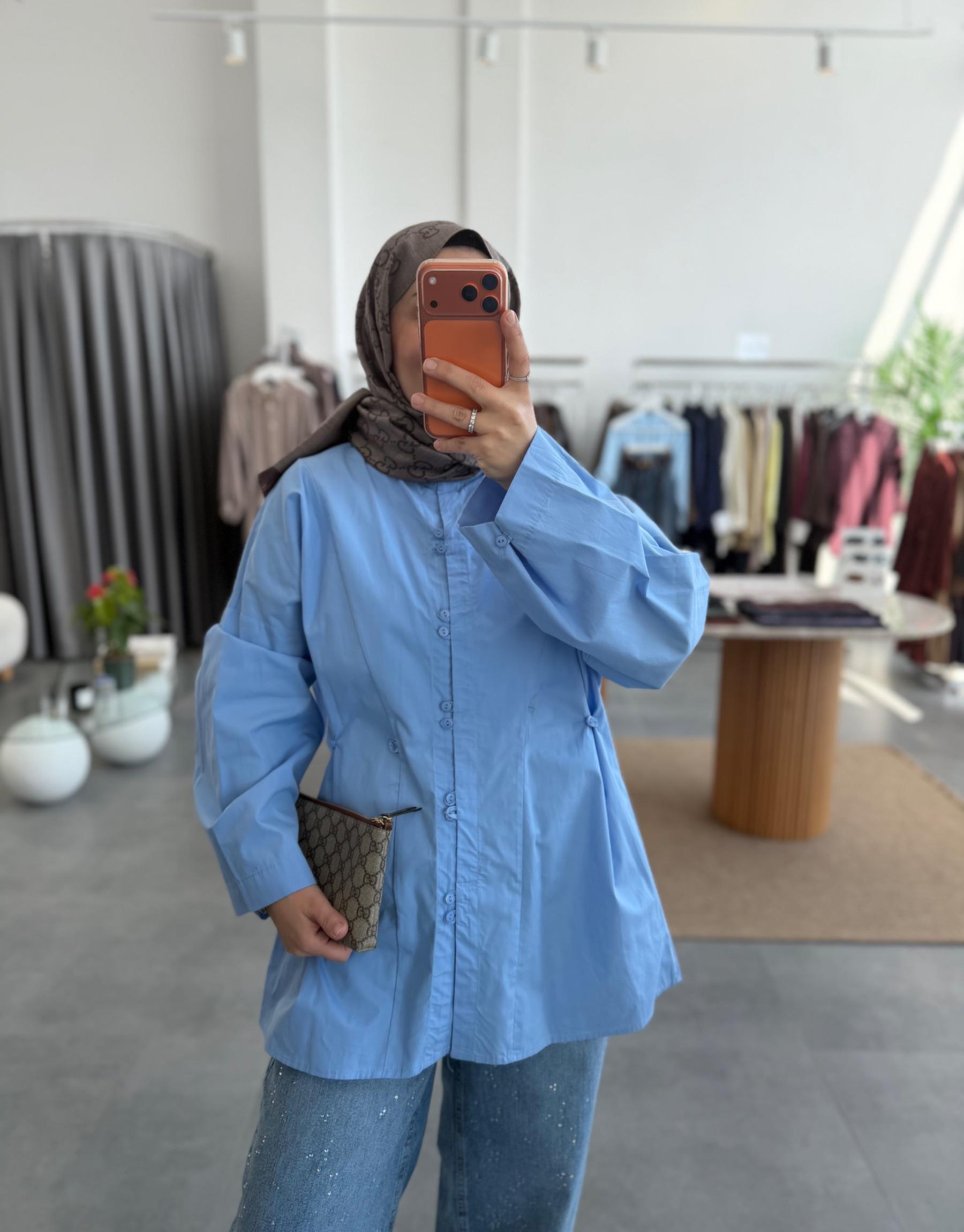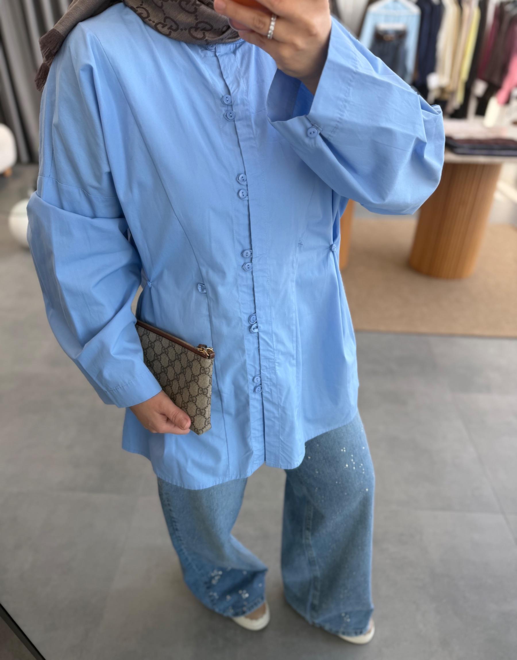 Mavi Birit Detaylı Poplin Gömlek