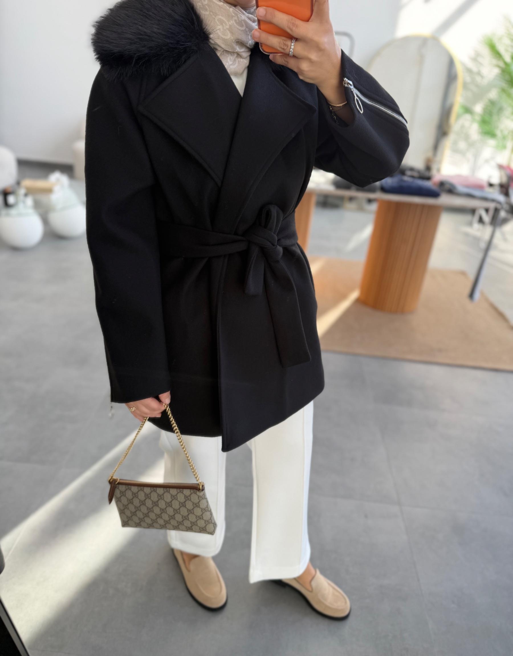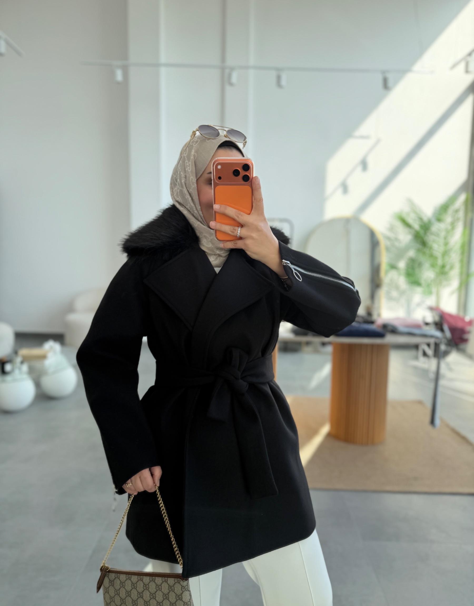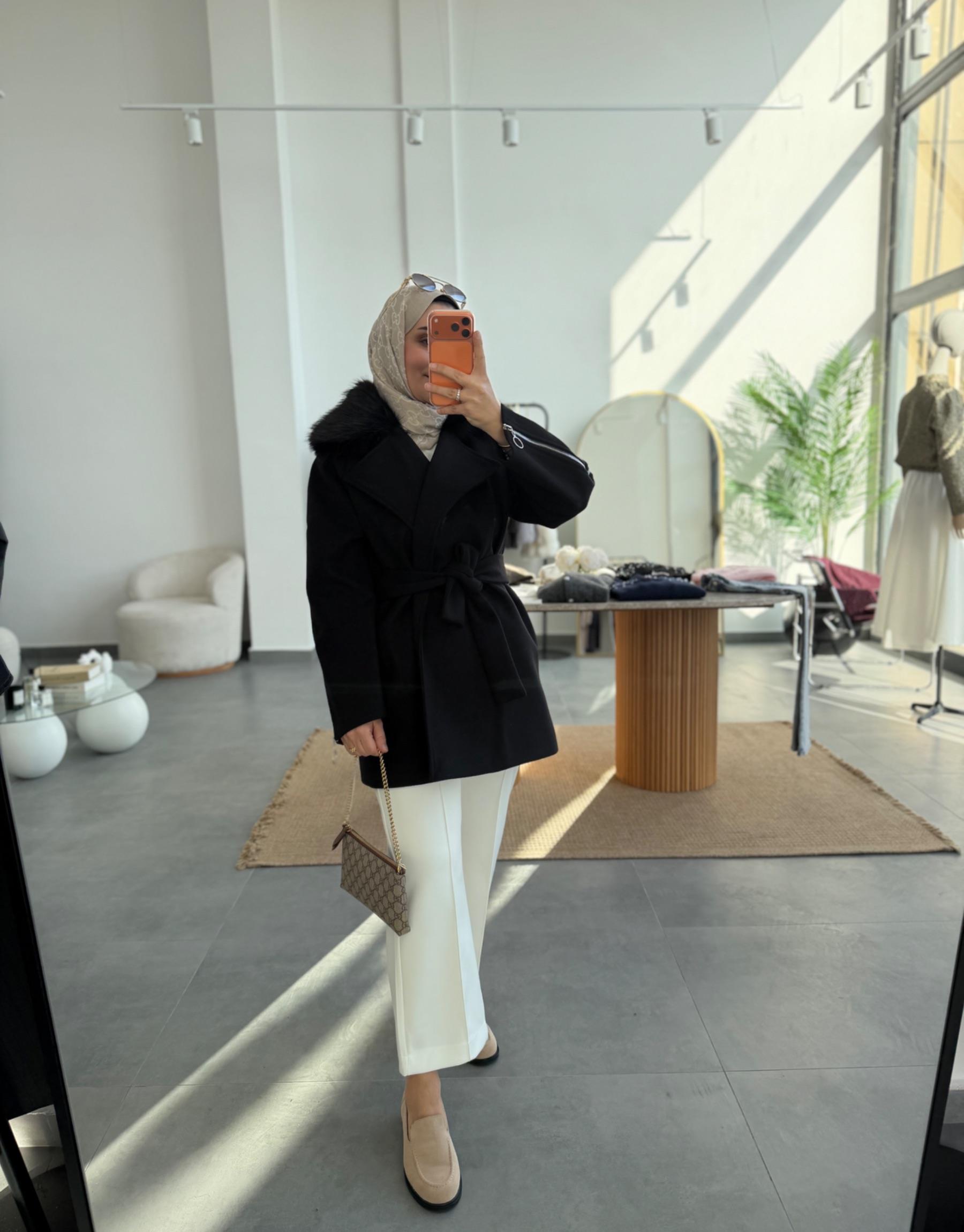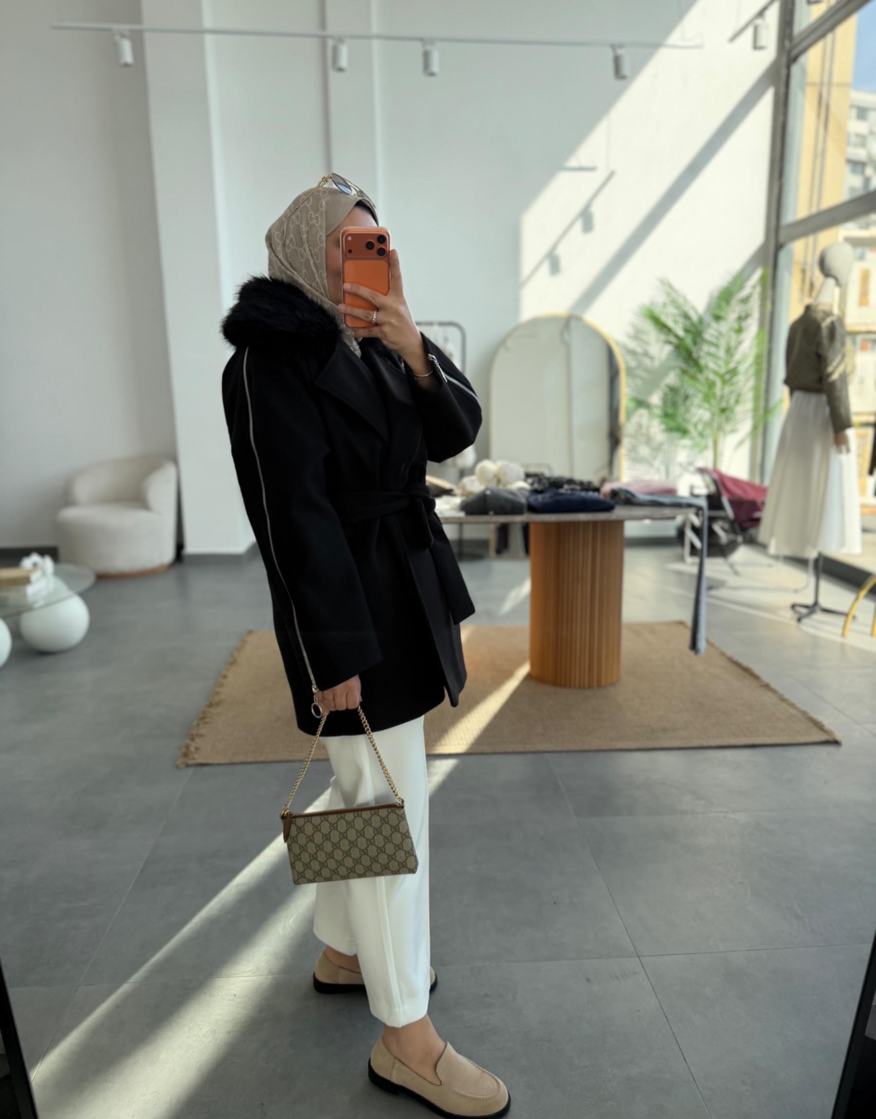 Siyah Fermuar Detaylı Yakası Kürklü Premium Kaban