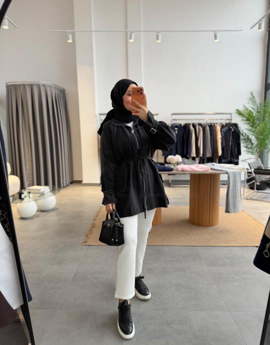 Siyah Apolet Detaylı Fermuarlı Ceket