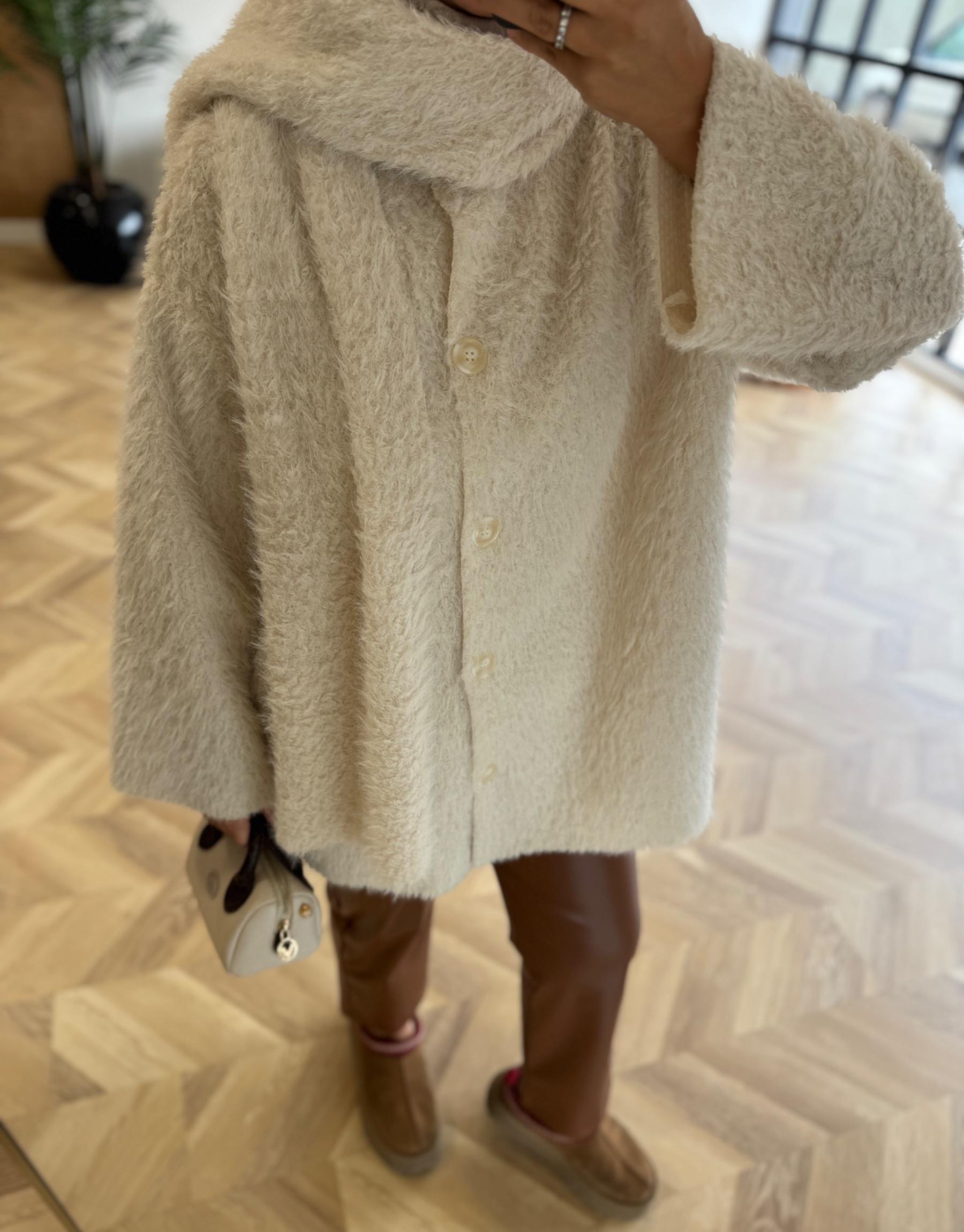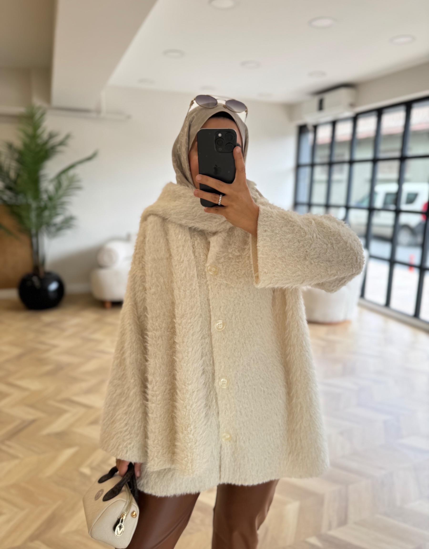 Taş Atkı Detaylı Sakallı Triko Ceket