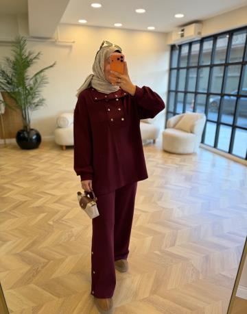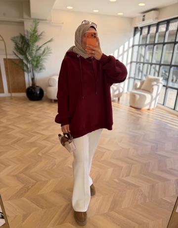 Bordo Kol Pile Detaylı Oversize Sweatshırt
