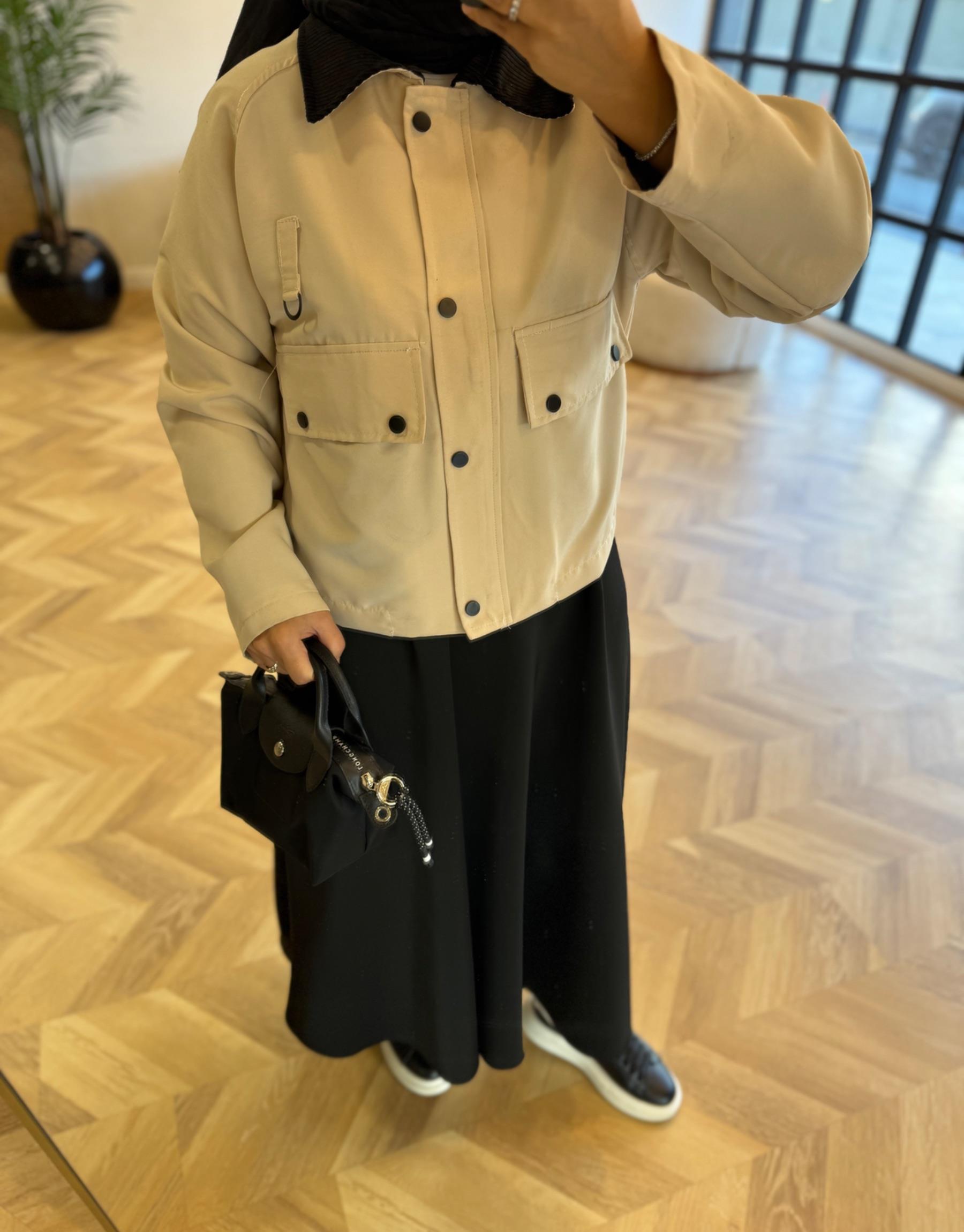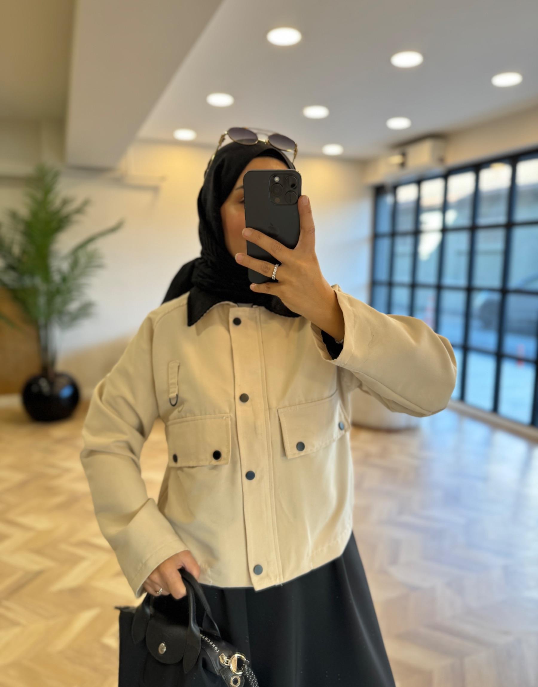 Bej Yaka Kadife Detaylı Kısa Treçnkot