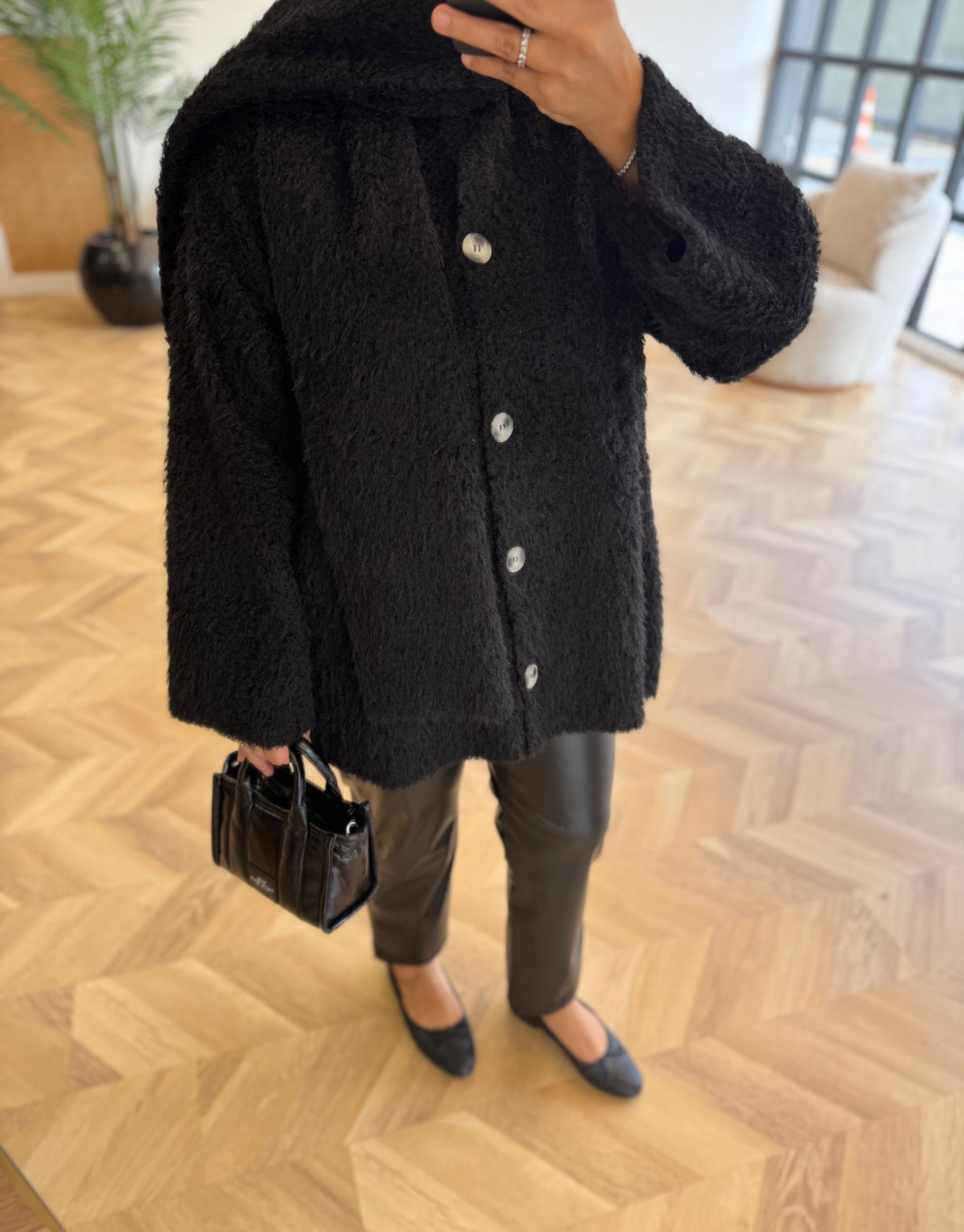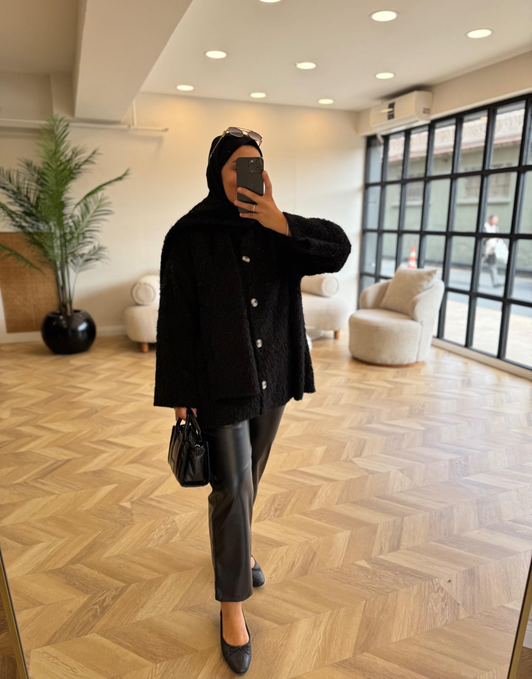Siyah Atkı Detaylı Sakallı Triko Ceket